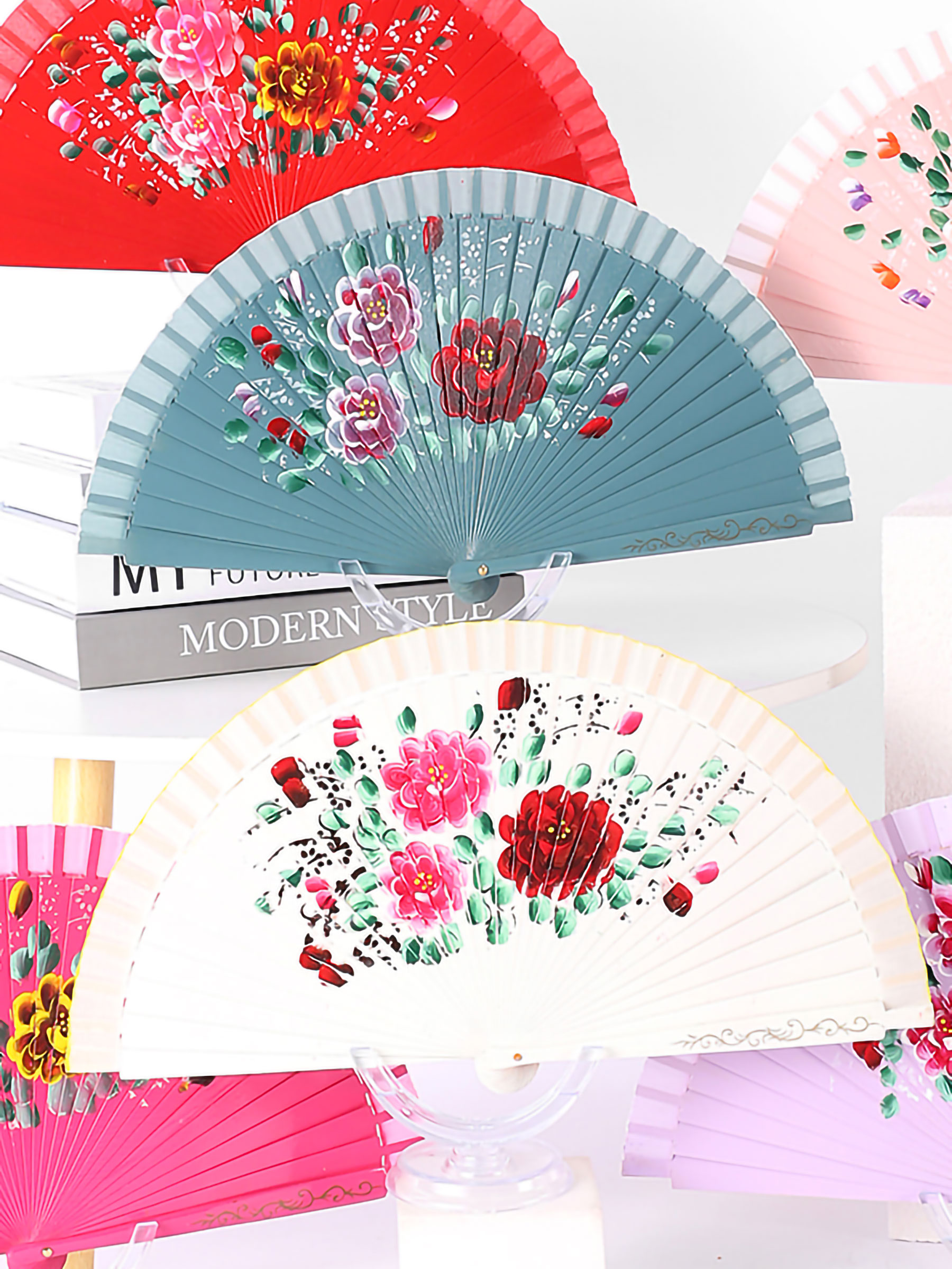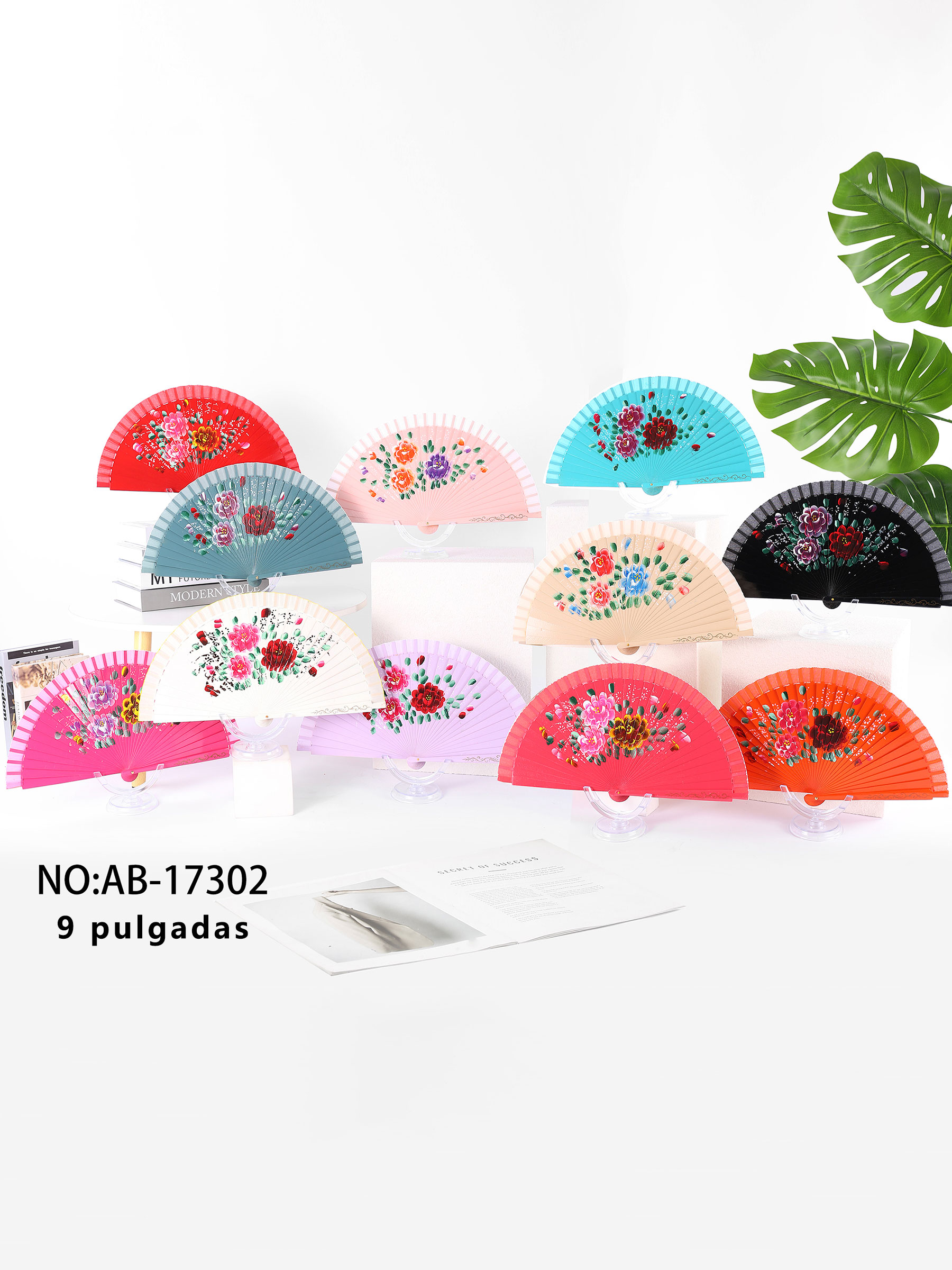 Ventaglio in legno decorato con peonie. Monofacciale. 23 cm. Colori assortiti.