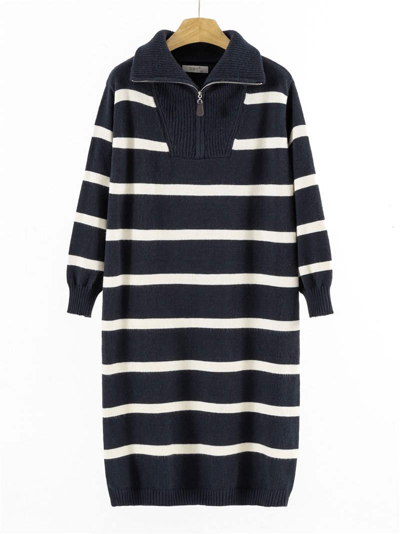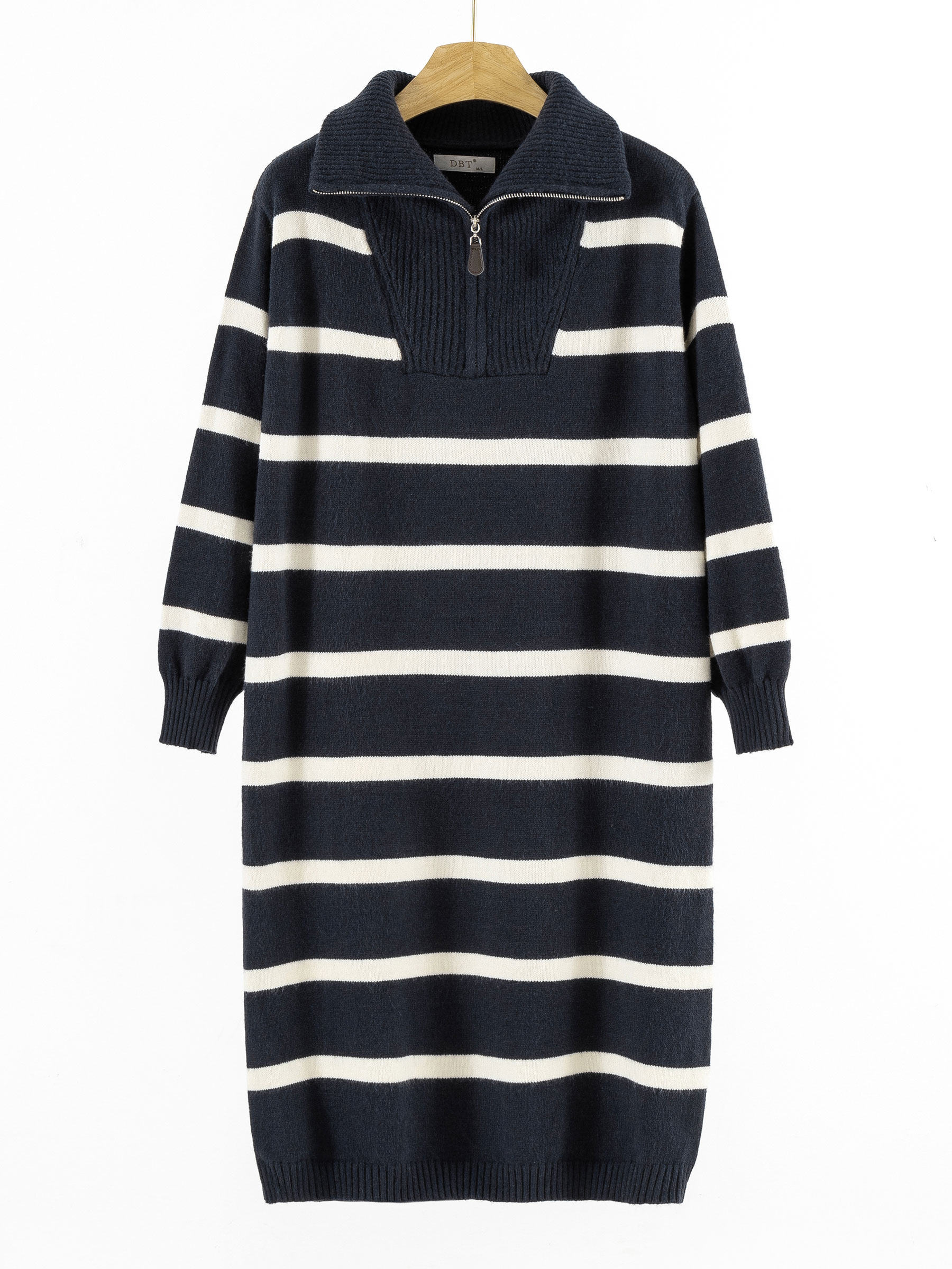 Vestito a righe in maglia. Collo con zip. Manica lunga.