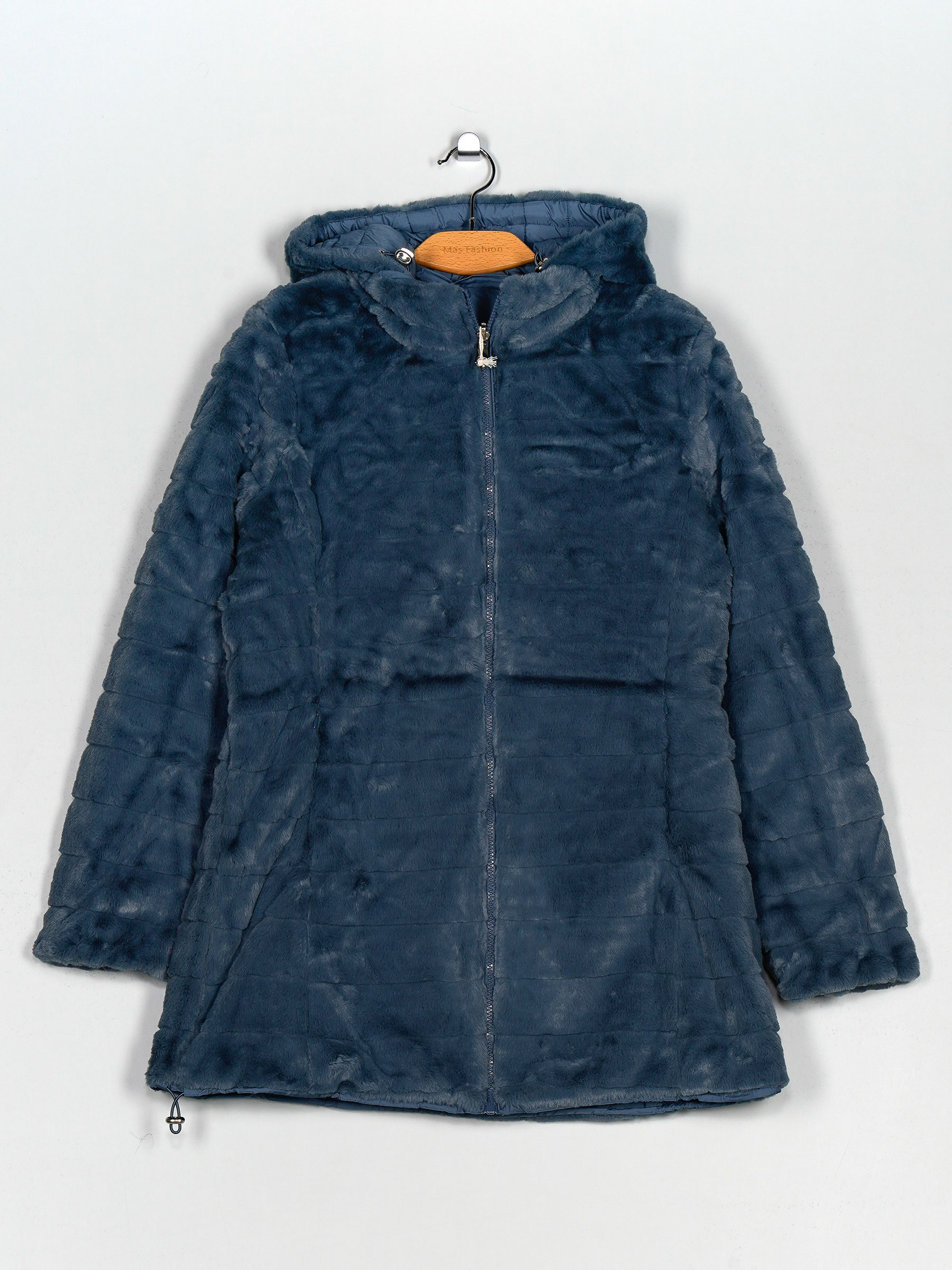 Anorak amplo reversível. Capuz removível. Gola alta. Acabamento interno com efeito de pelo combinado. Bolsos laterais com zíperes. Manga longa. Fecho central com zíper.