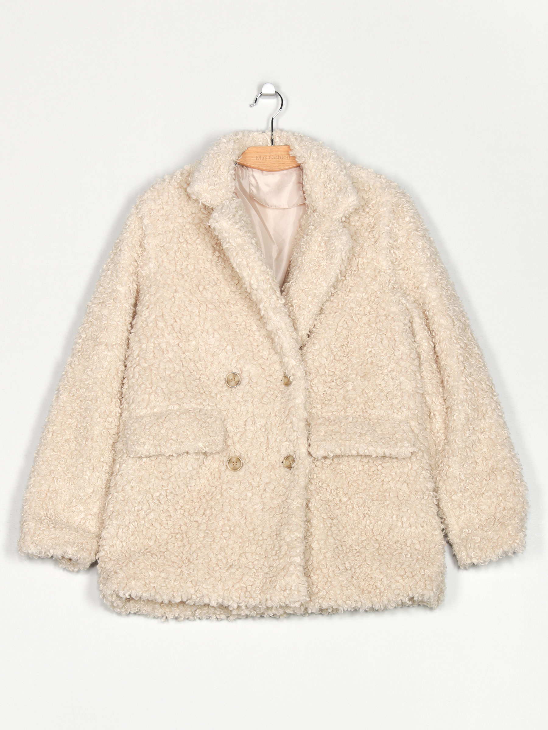 Casaco de pele de carneiro. Bolsos frontais com aba. Gola de lapela. Manga comprida. Fecho duplo de botões na frente.