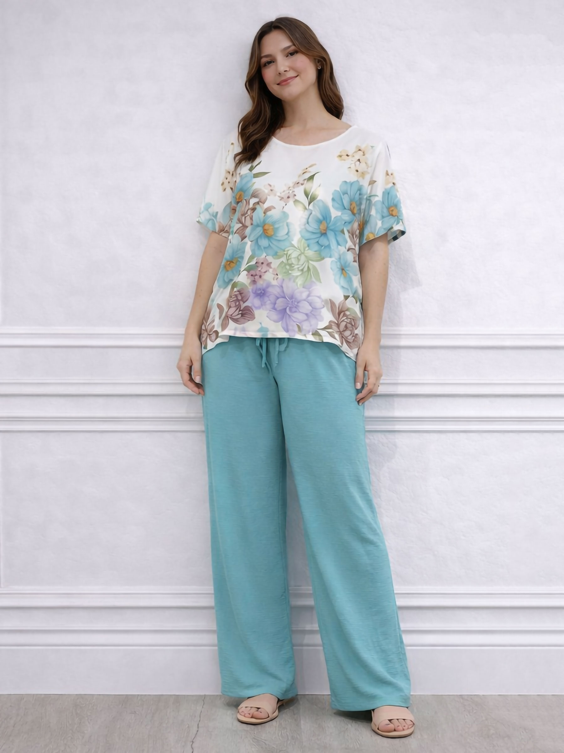 Conjunto de blusa e calça com estampa floral.