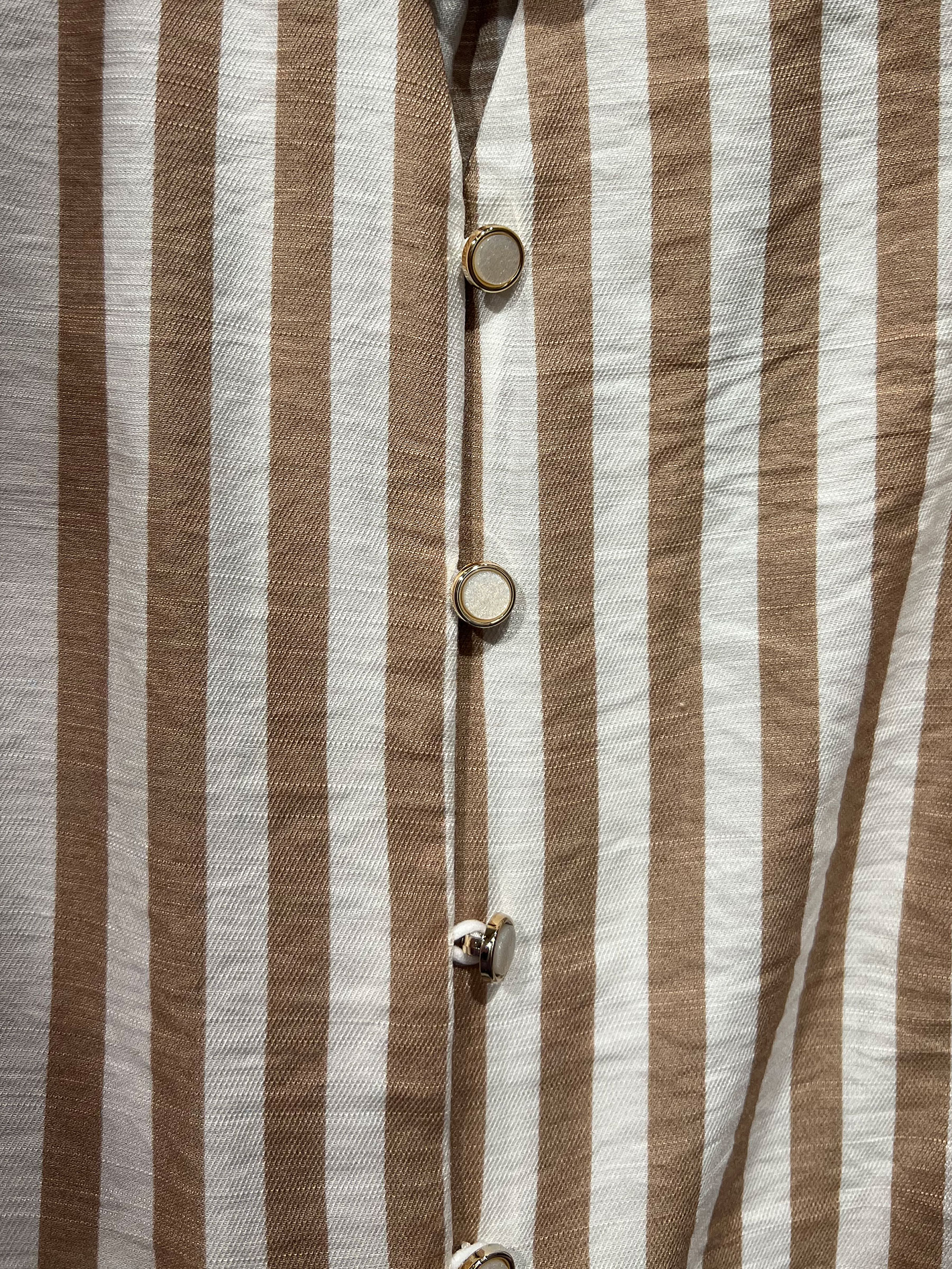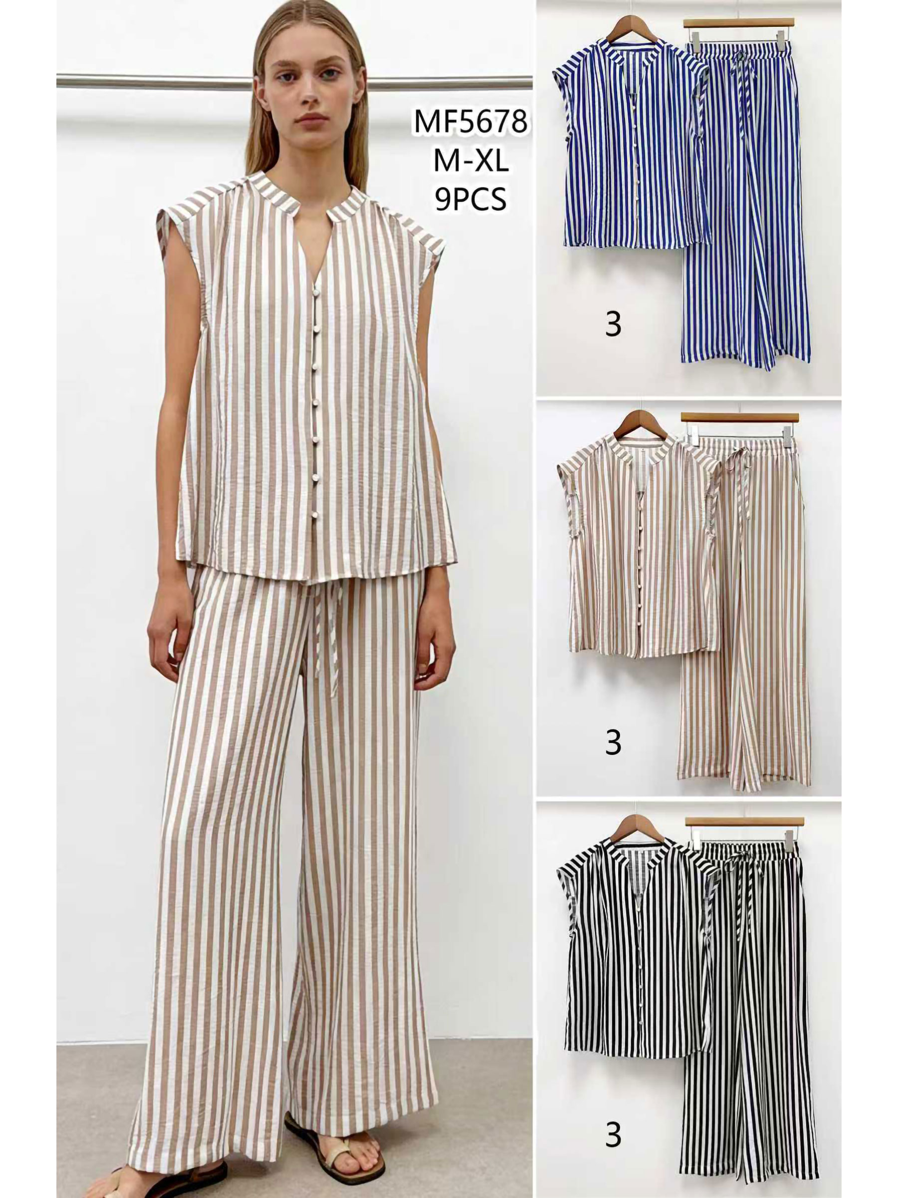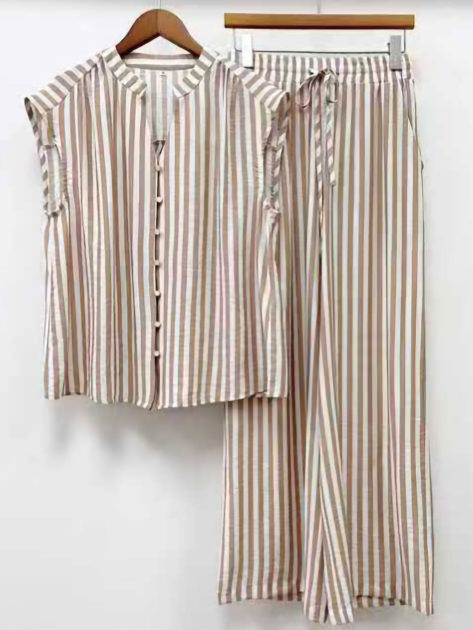 Conjunto de duas peças. Estampa listrada. Blusa fluida sem mangas com botões. Calça pantalona. Cintura elástica com cordão. Tamanhos: M-G-GG. Coleção: Primavera/Verão 2026.