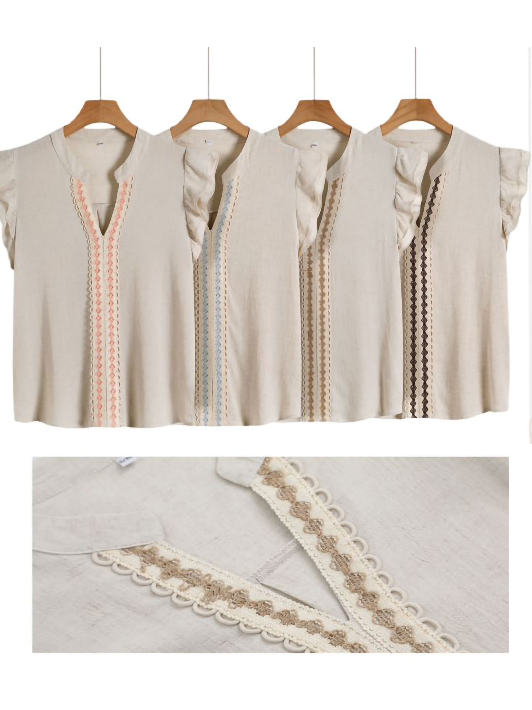 Blusa sem mangas com acabamento em linho. Detalhe bordado central. Decote em V. Ombros com babados.