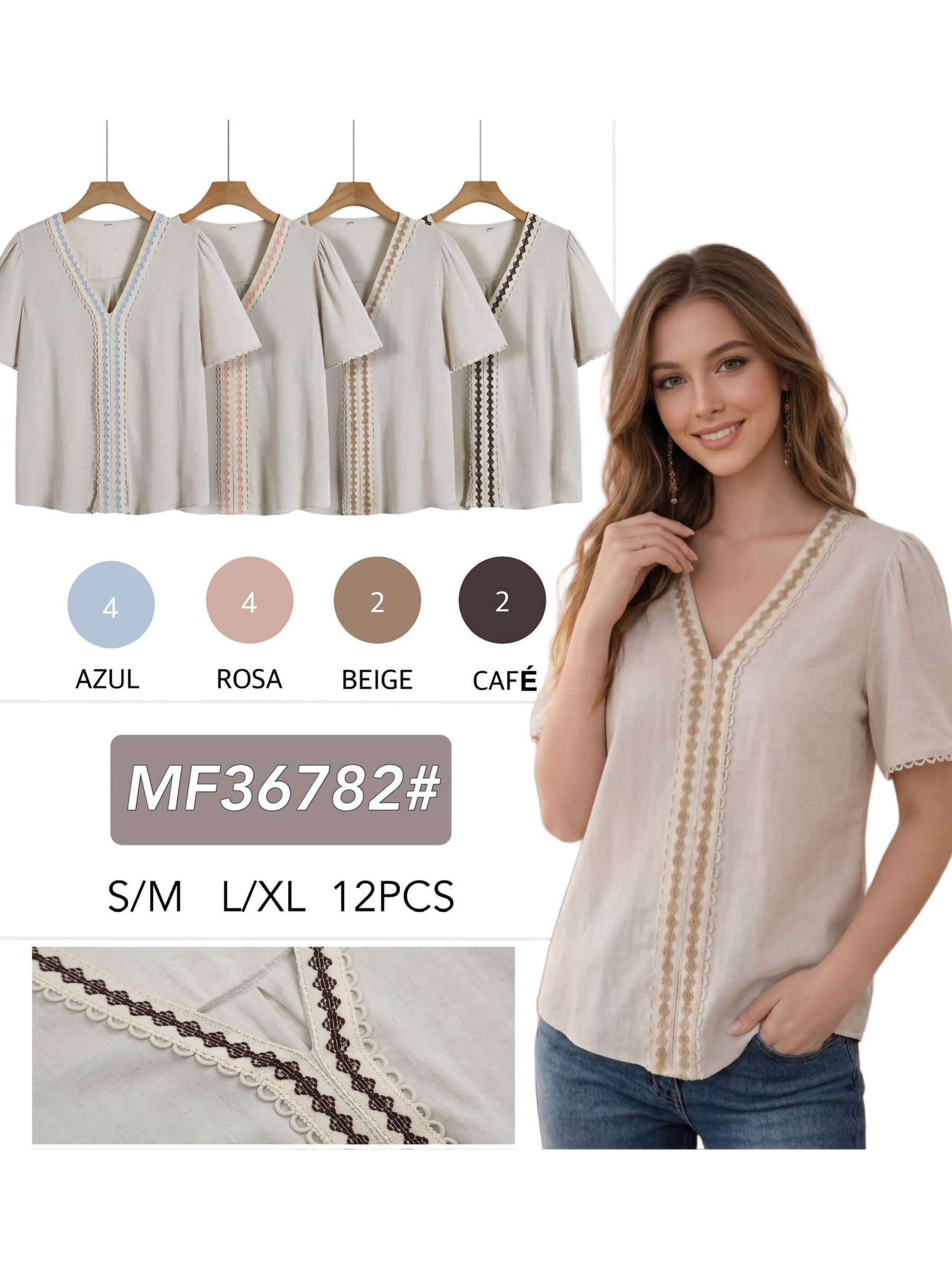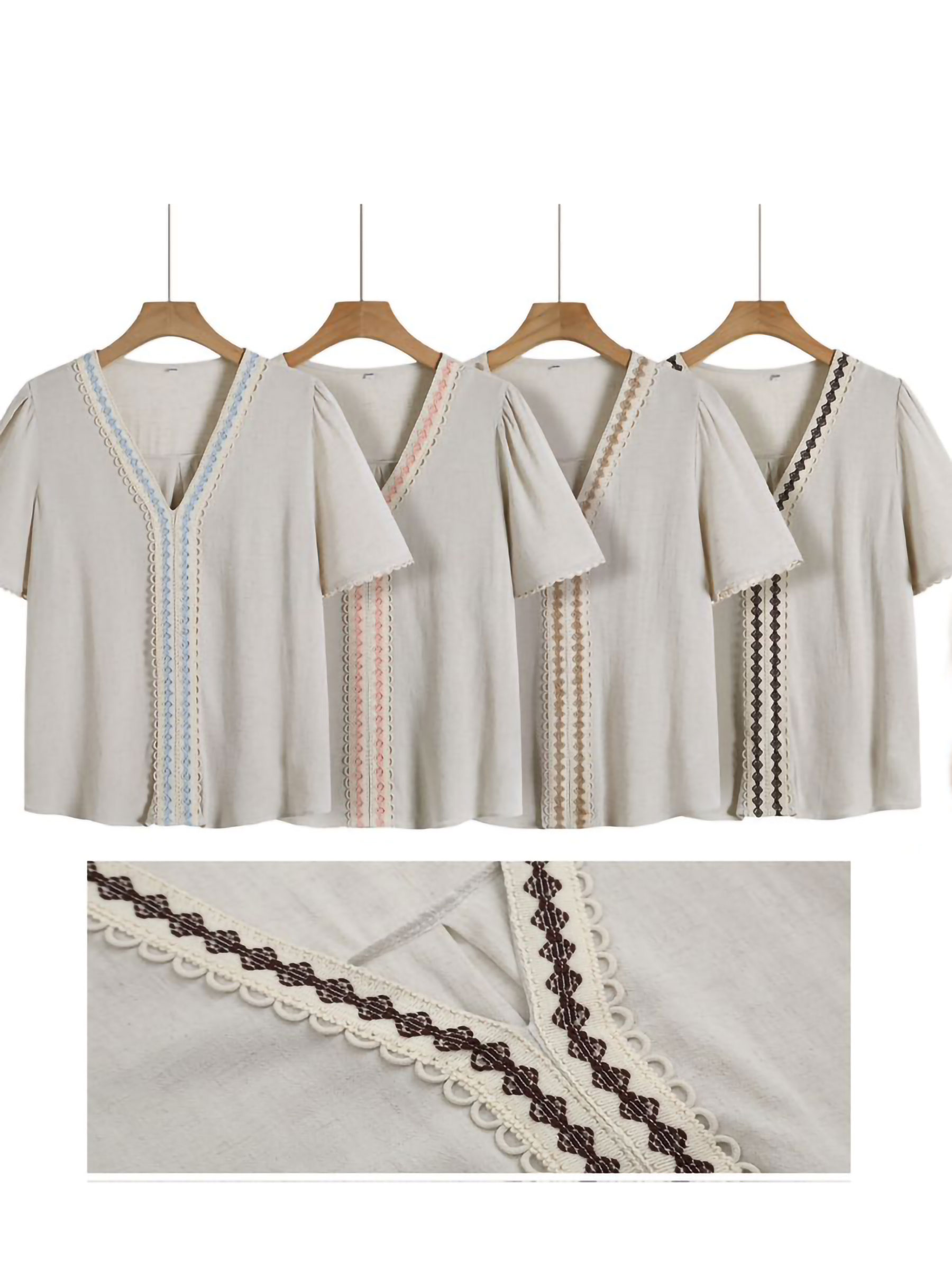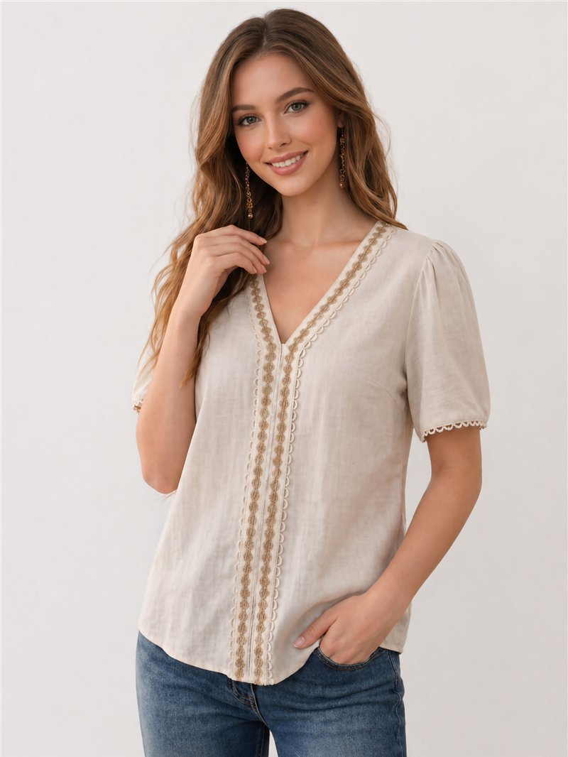 Blusa com efeito linho. Detalhe bordado central. Decote em V. Mangas curtas. Acabamento em renda.
