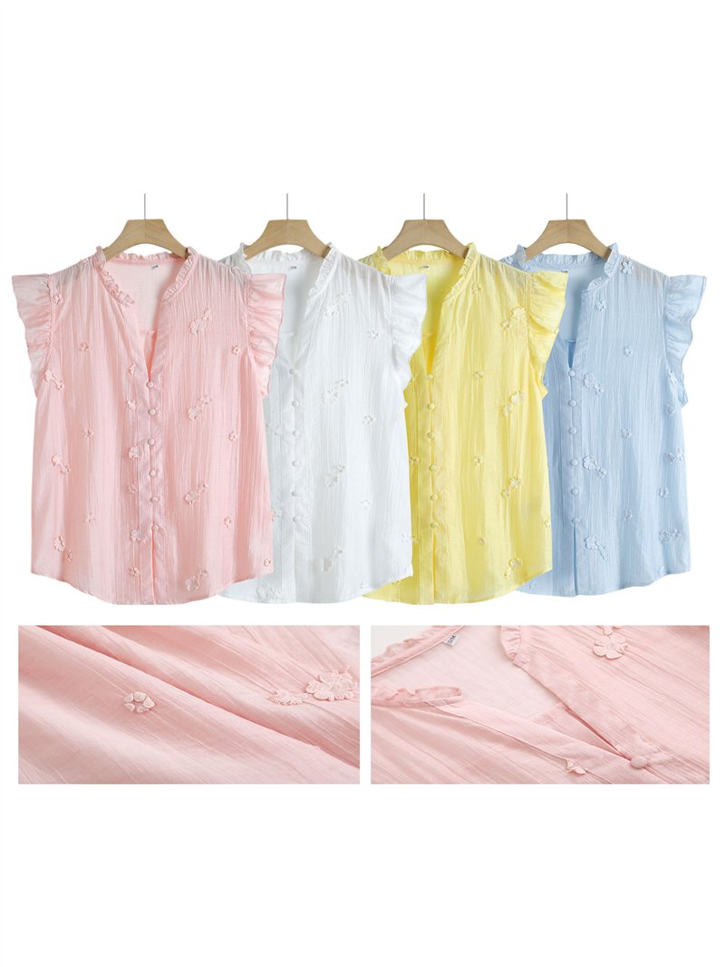Blusa sem mangas. Detalhe floral bordado. Decote em V com babado. Ombros com babados. Fechamento frontal com botões.