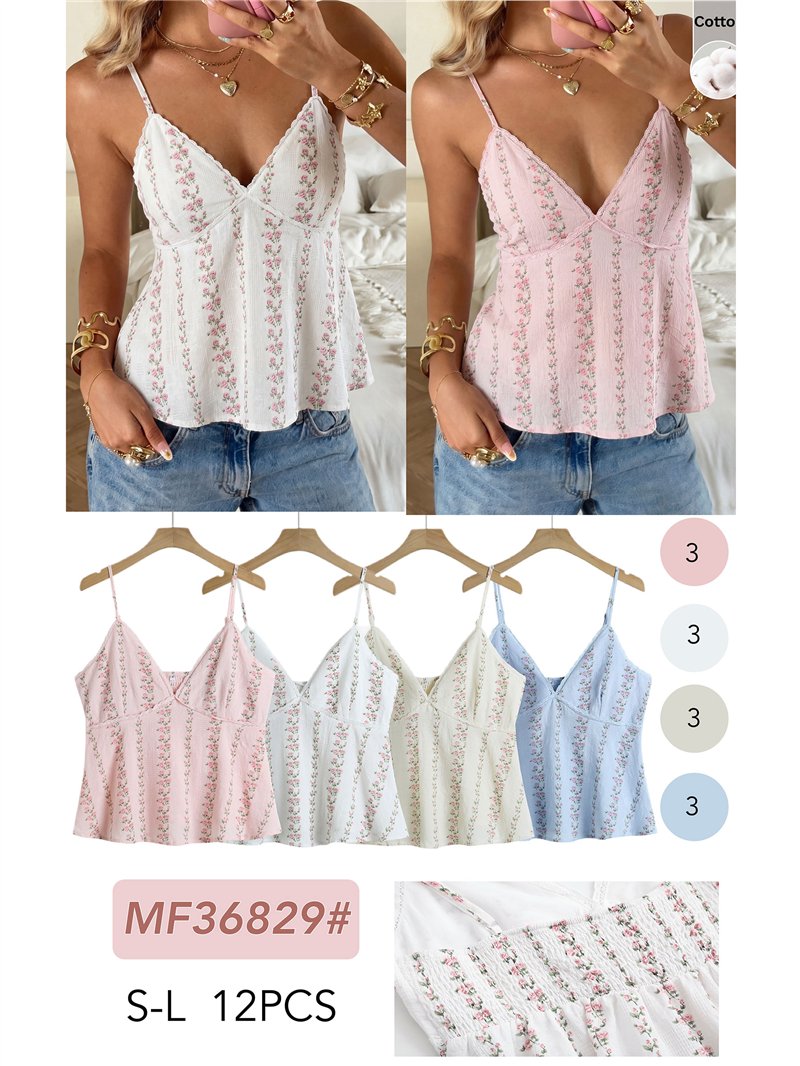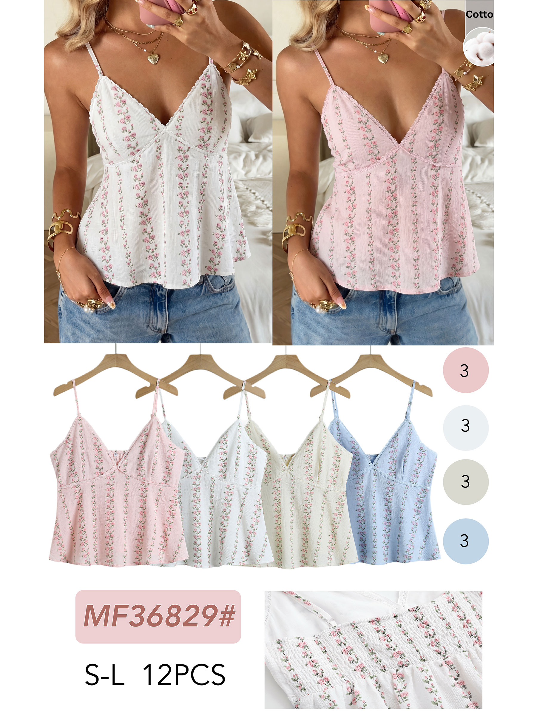 Regata com estampa floral. Decote em V. Detalhe em renda. Alças finas ajustáveis. Costas com franzido elástico.