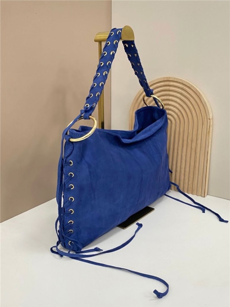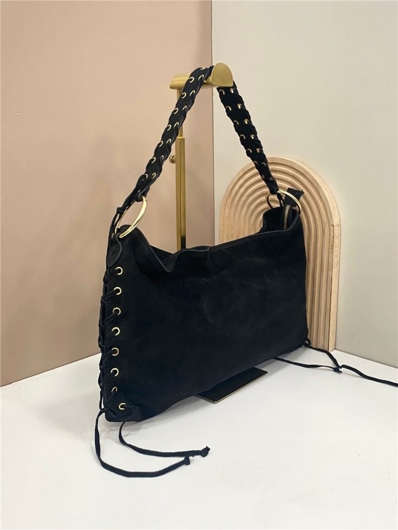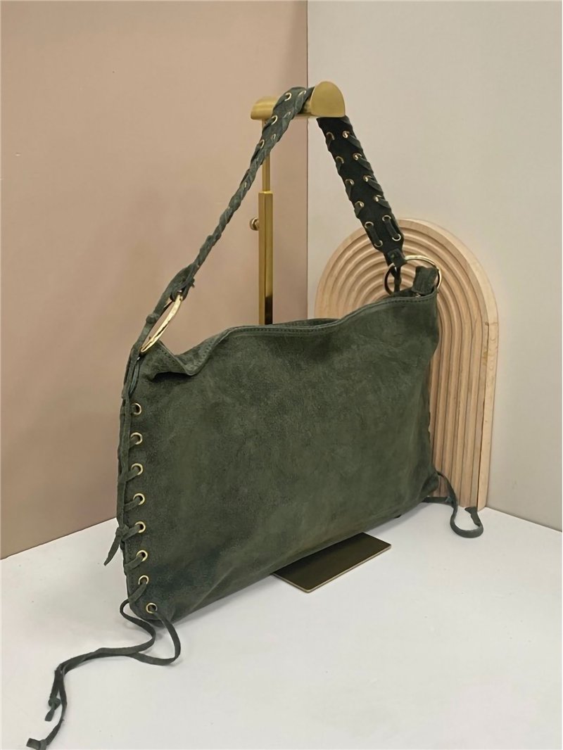Bolsa de ombro em camurça com alça trançada e laterais com cordões.