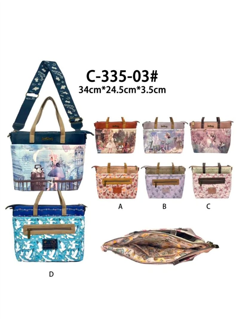 Bolsa tote estampada de poliuretano. Alça transversal larga ajustável. Bolso traseiro com zíper. Fecho com zíper.