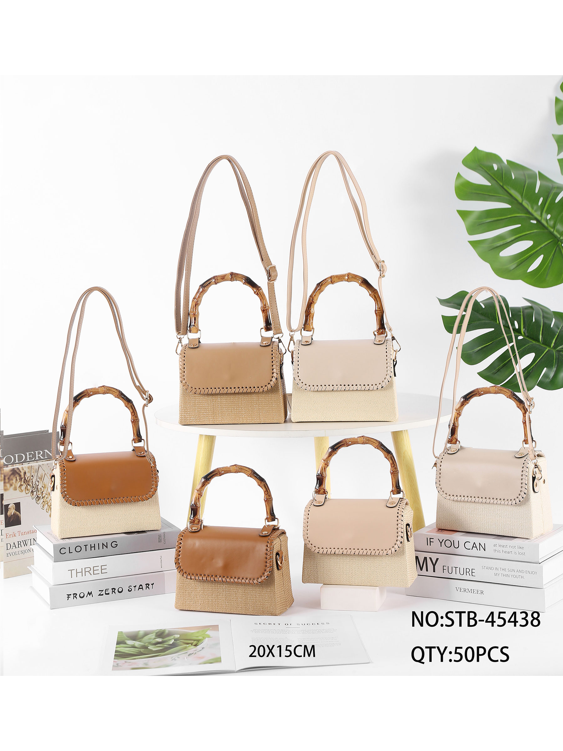 Mini sacola rígida de ráfia com alça imitando bambu Mini sacola rígida de ráfia com alça imitando bambu