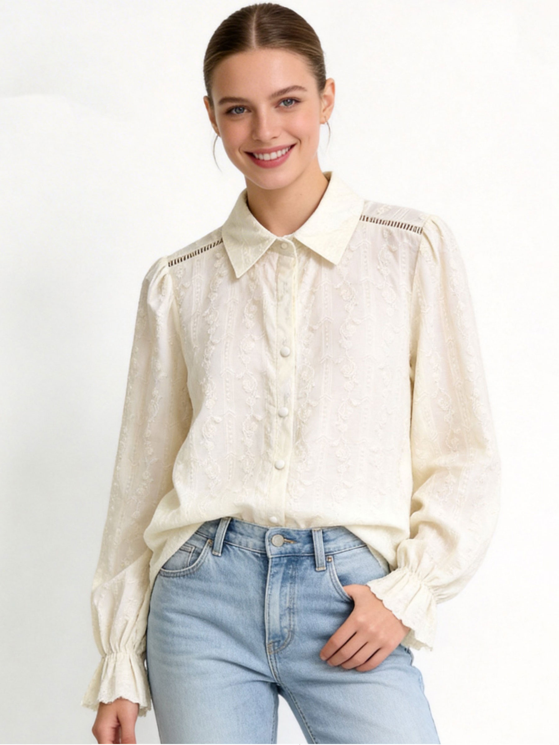 Mín. 6 Camisas Blusa de renda com botões em forma de coração. MF-MF5631 Camisa de renda. Fecho frontal com botões. Mangas compridas com punhos. Tecido semitransparente.Coleção: Primavera/Verão 2026 Ver preço
