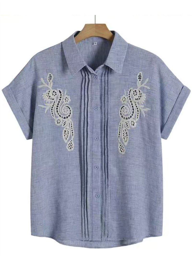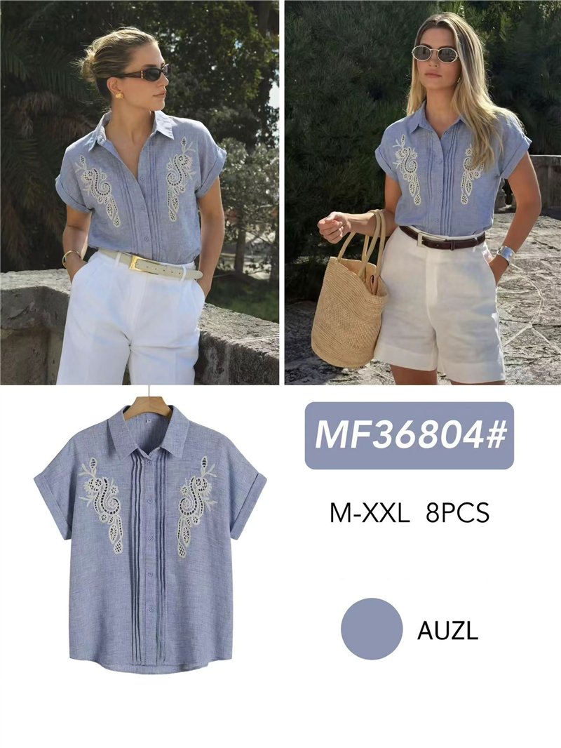 Camisa com efeito linho. Detalhe bordado vazado. Gola com lapela. Mangas curtas com punhos dobráveis. Fecho com botões.