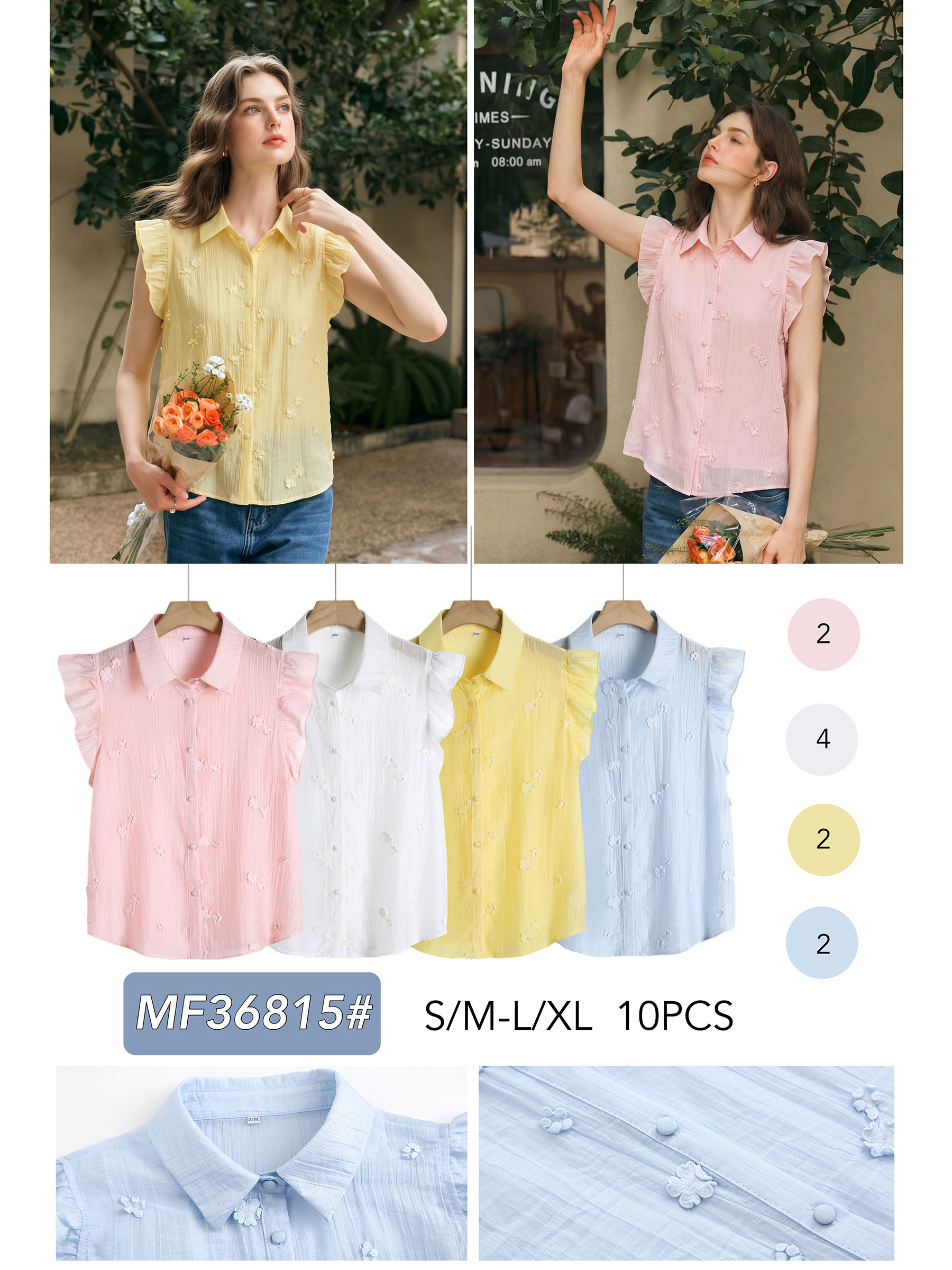 Camisa sem mangas. Detalhe floral bordado. Gola com lapela. Ombros franzidos. Fechamento frontal com botões.