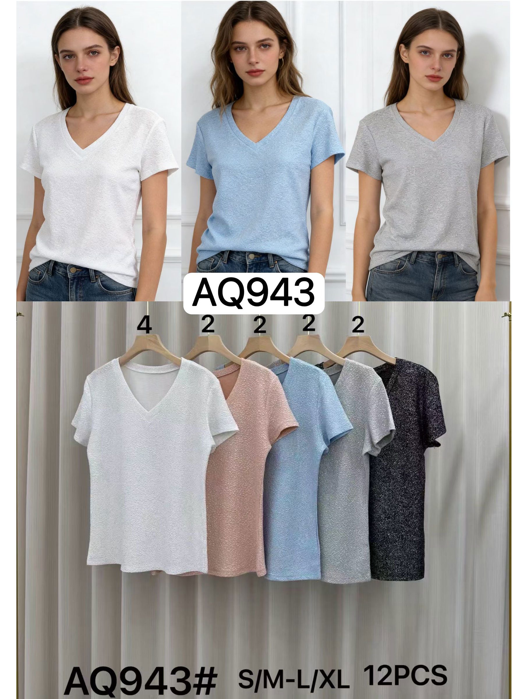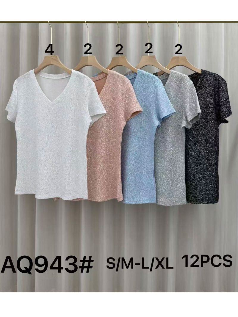 Camiseta metalizada. Decote em V. Mangas curtas. Tecido elástico.