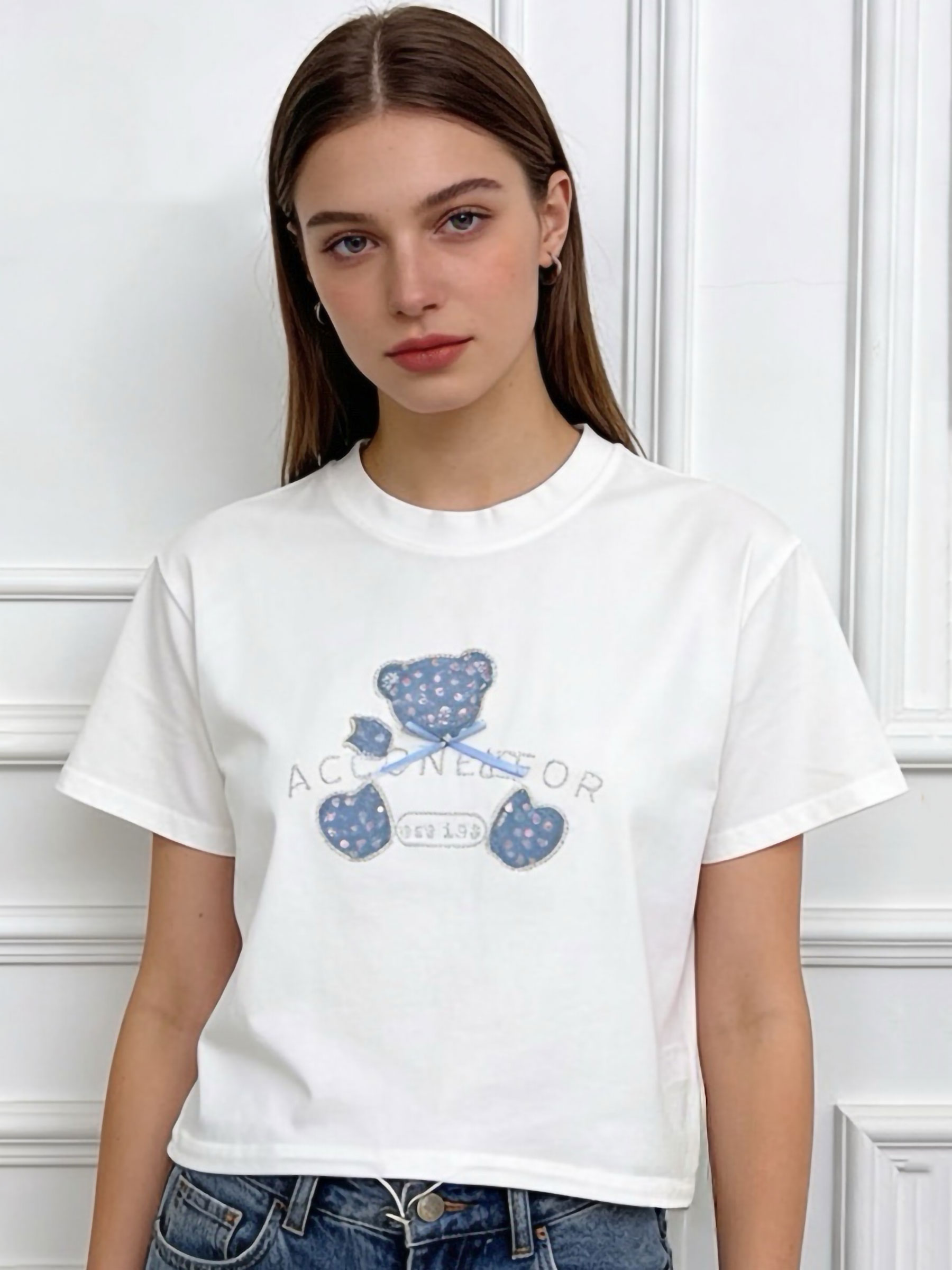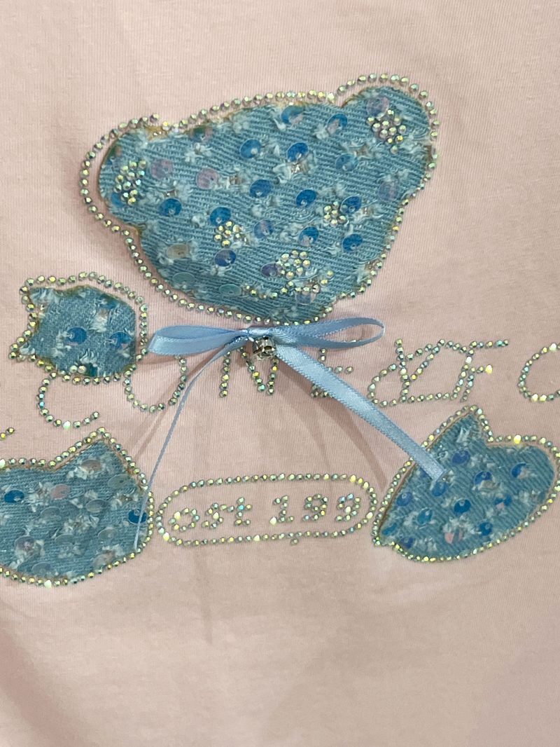 Camiseta de manga curta. Estampa de ursinho de pelúcia com laço e strass.
