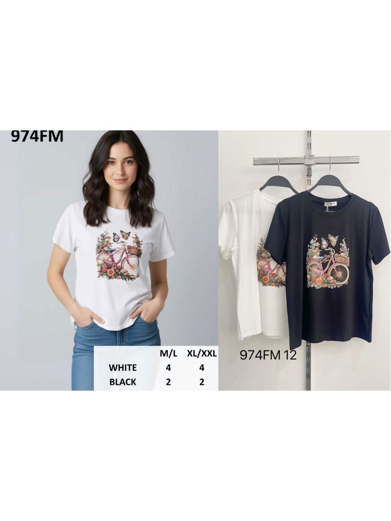 Camiseta estampada com bicicleta e flores.