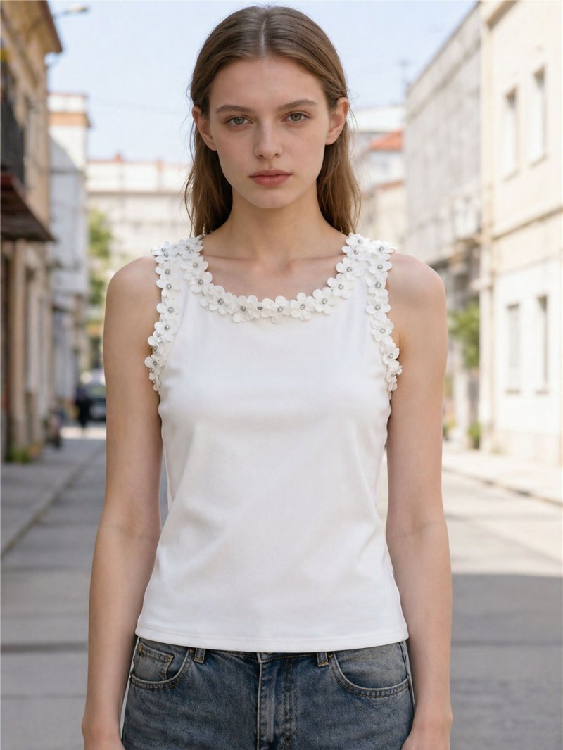 Camiseta sem mangas. Detalhe floral em relevo na gola e nas cavas. Decote redondo. Tecido elástico.