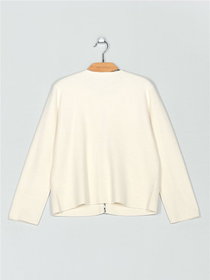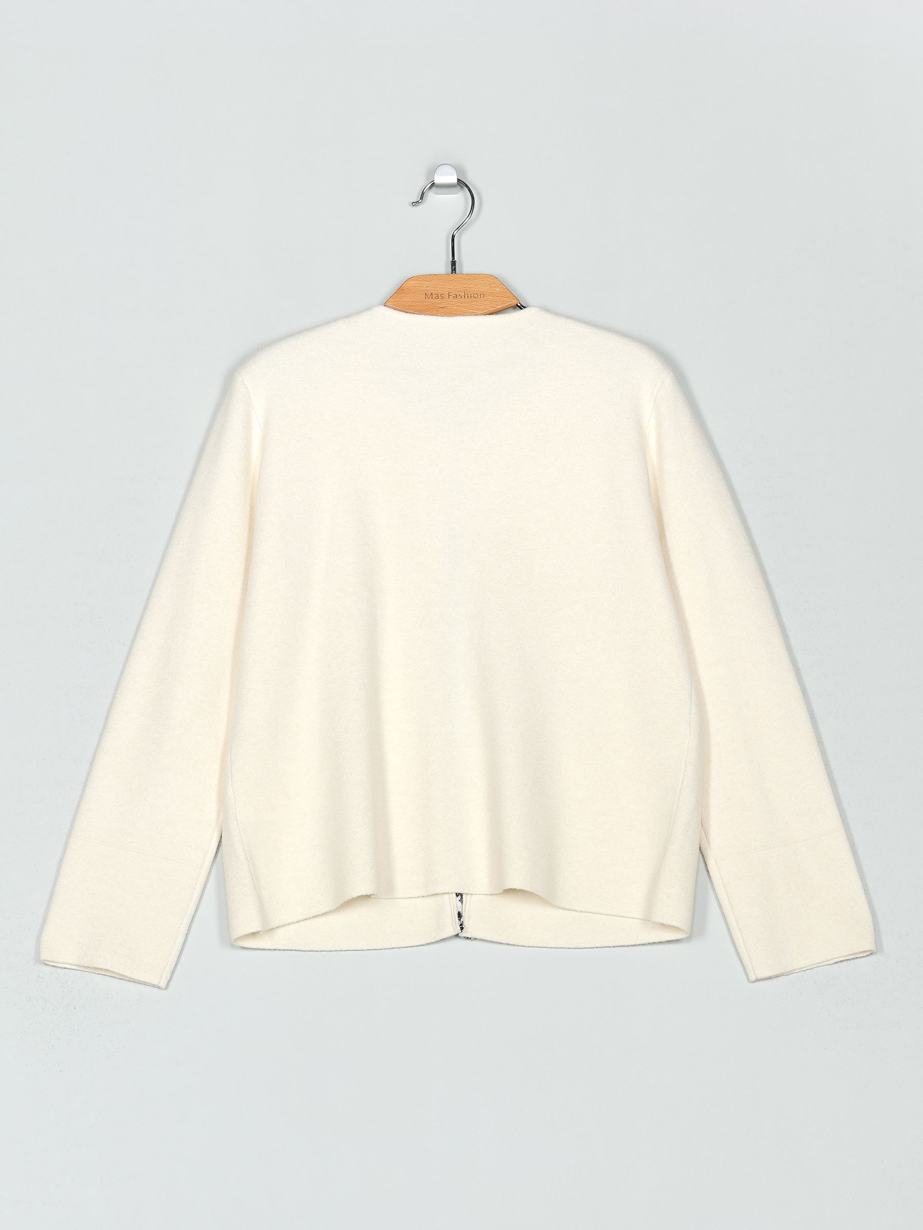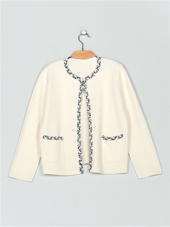 Casaco de malha quente. Toque suave. Detalhe tweed. Bolsos frontais de aba. Gola redonda. Manga comprida. Fecho com gancho.