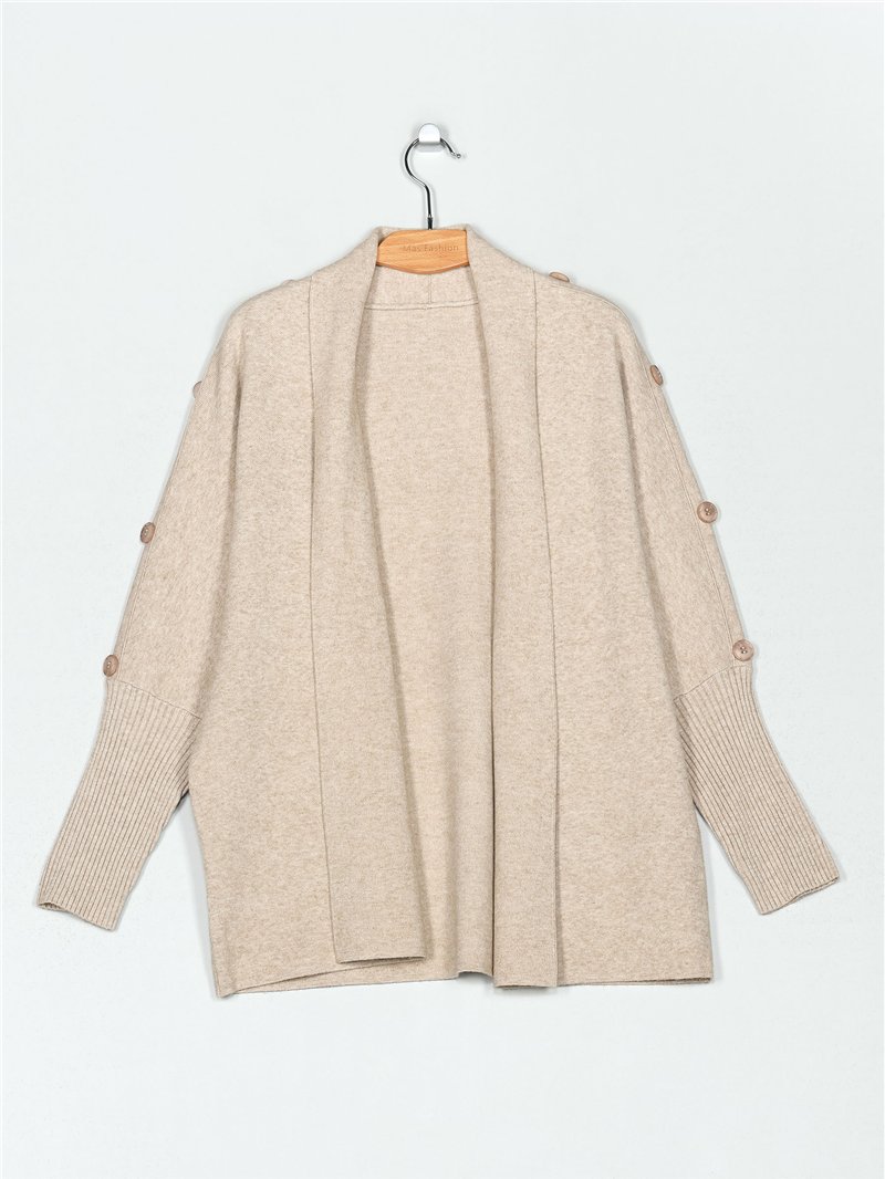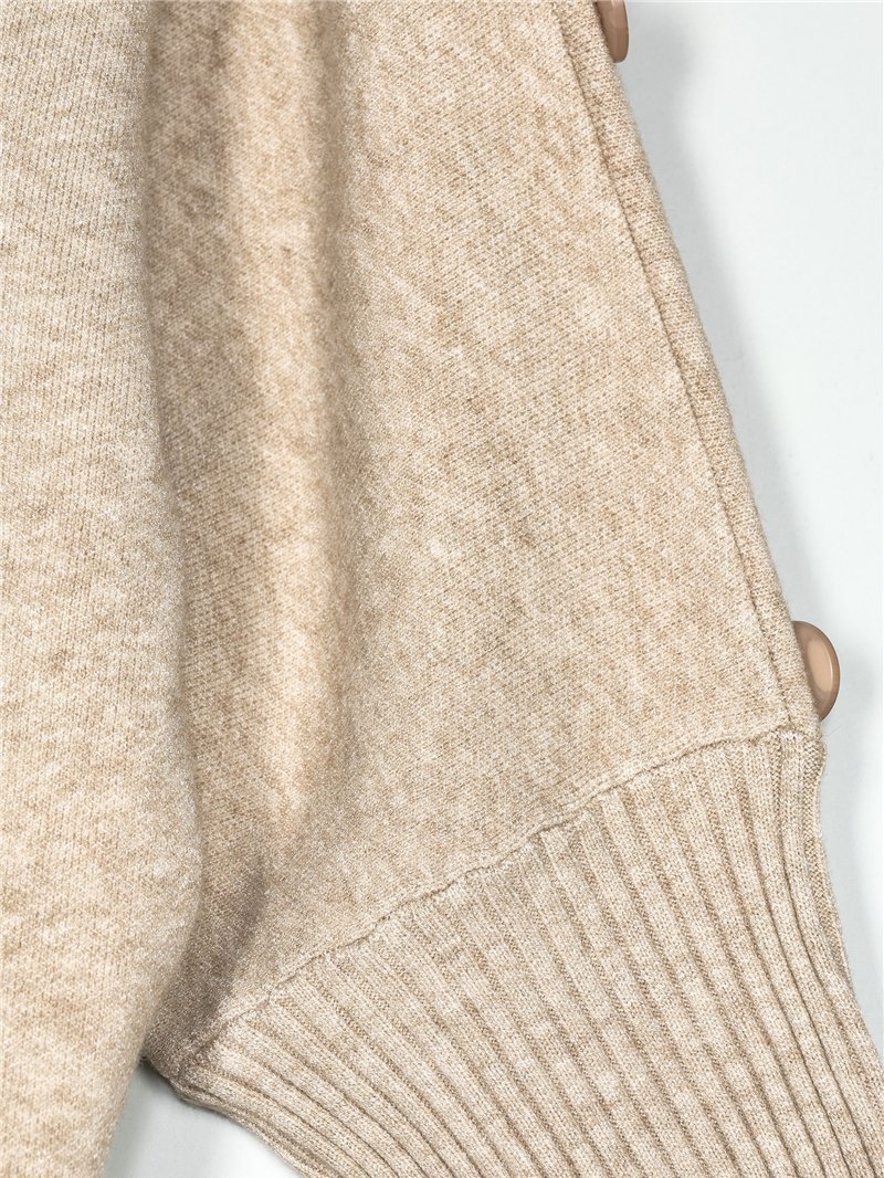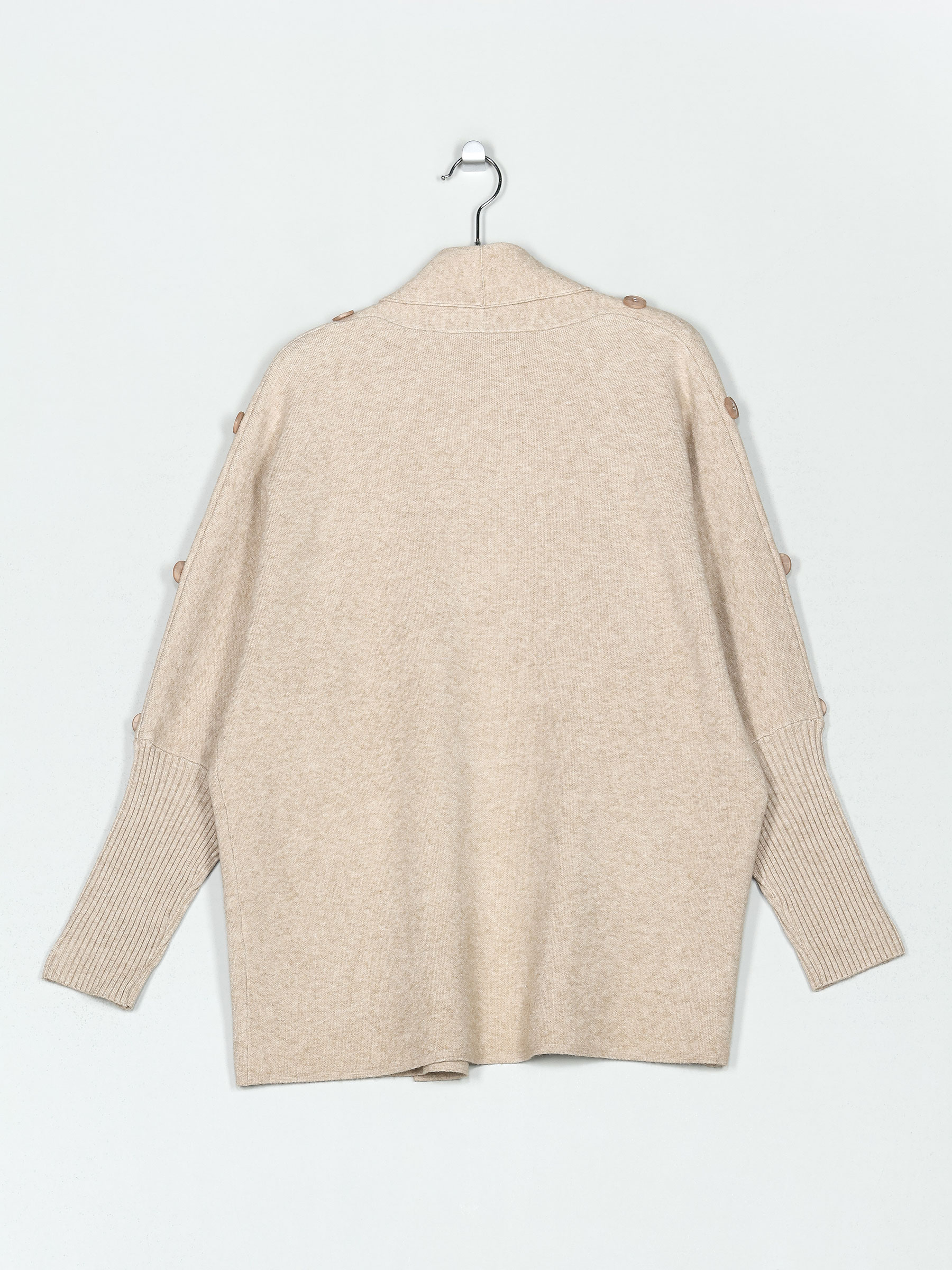 Casaco de malha quente. Toque suave. Tamanho grande. Detalhe de botões. Gola cachecol. Manga comprida.