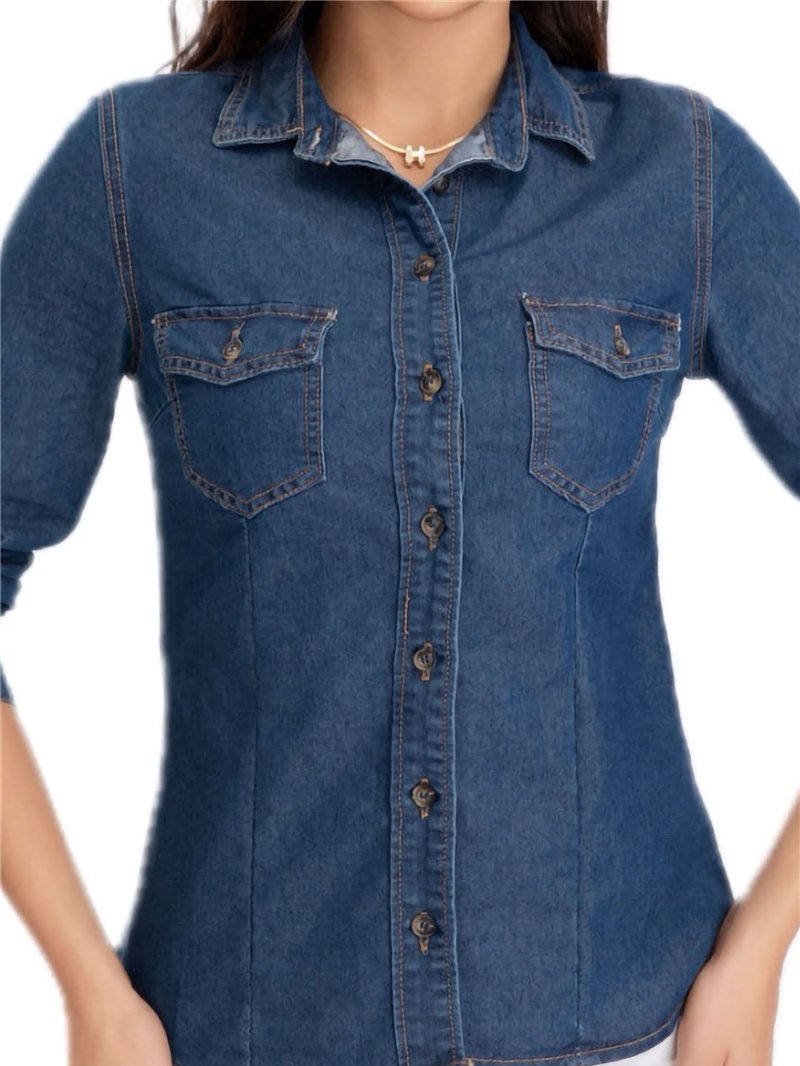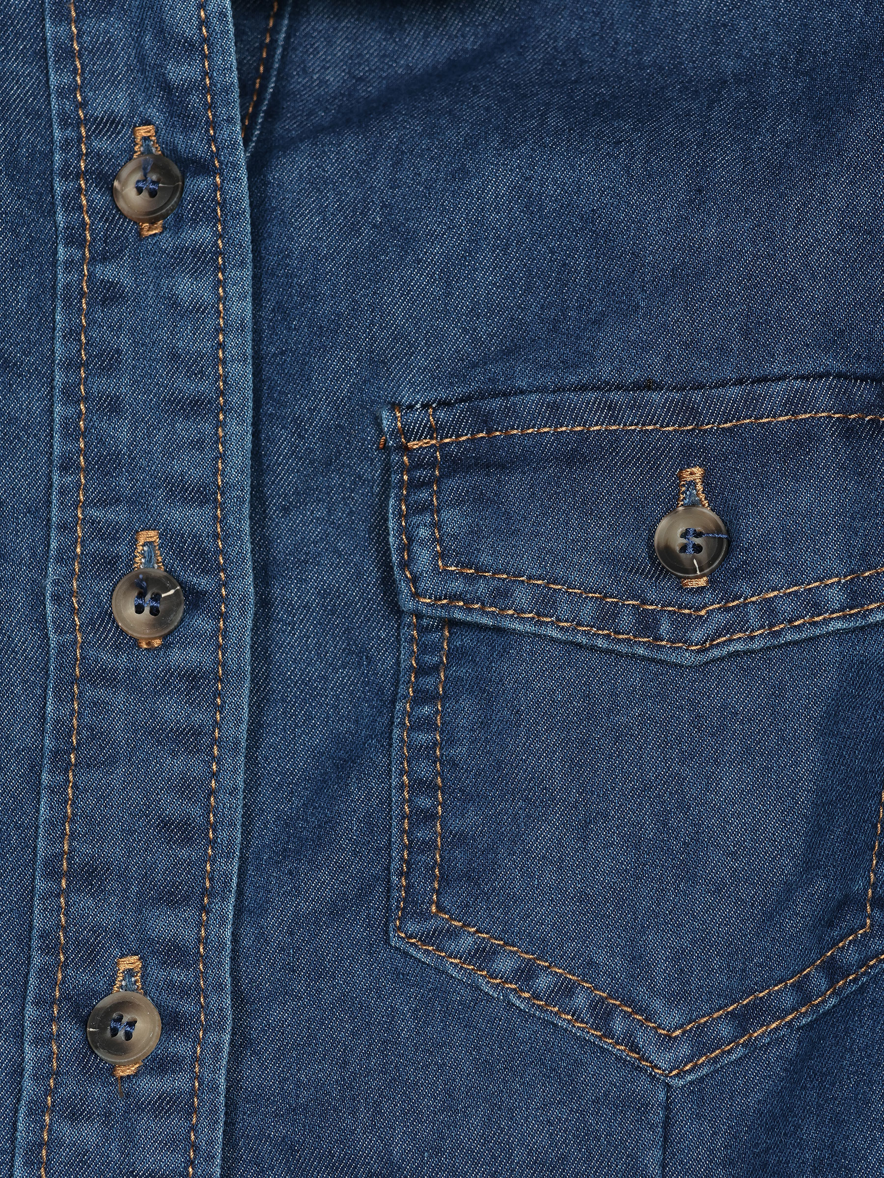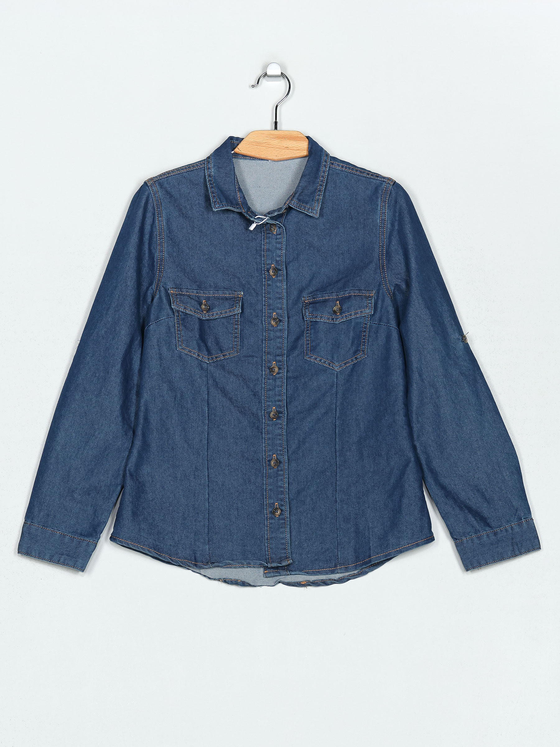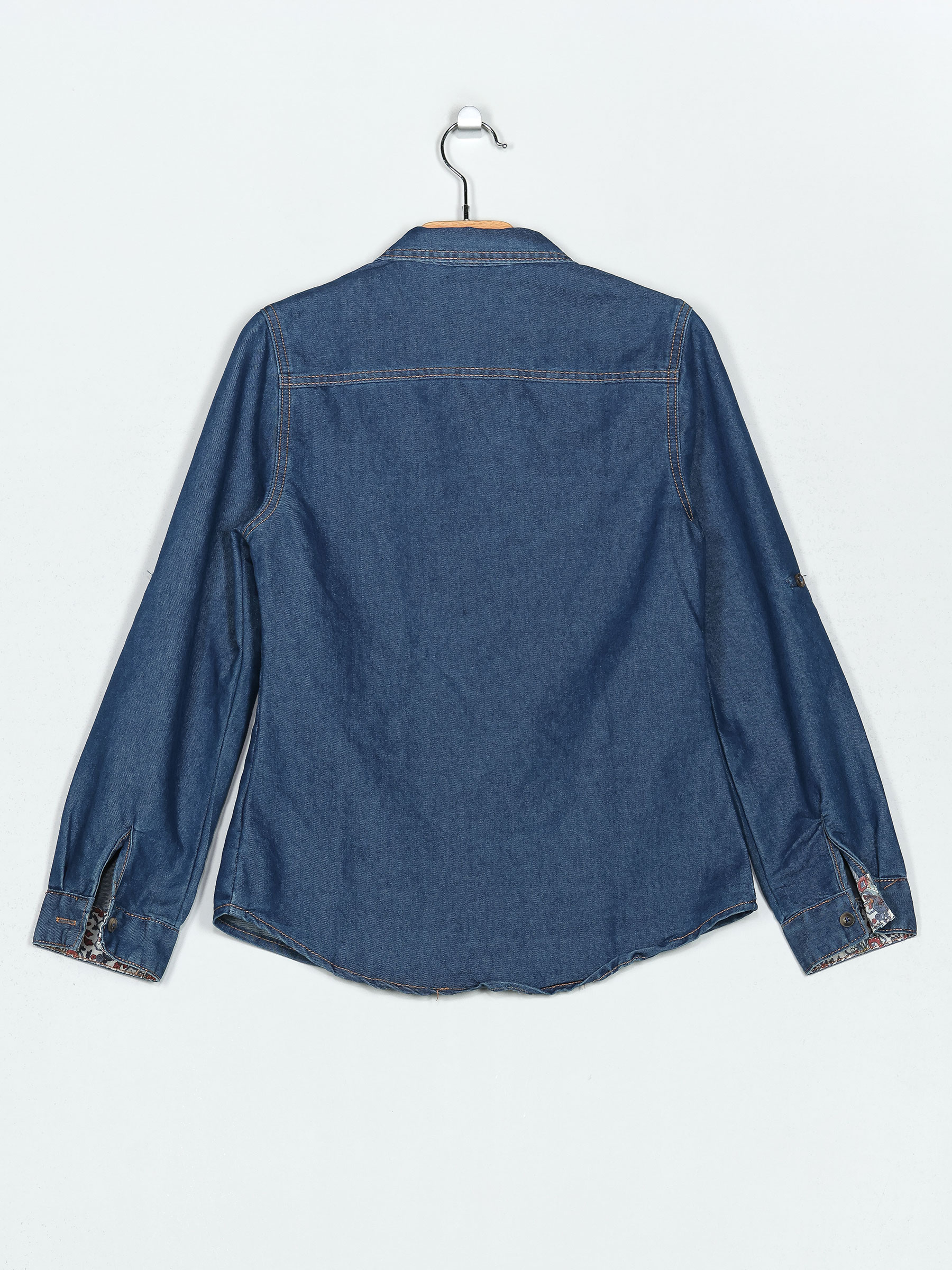 Camisa de ganga. Bolso de plastrón com aba no peito. Tecido não elástico. Gola de lapela. Manga comprida com detalhe de presilha. Fecho frontal com botões. Medidas de S: comprimento - 68 cm, peito - 92 cm, cintura - 84 cm.