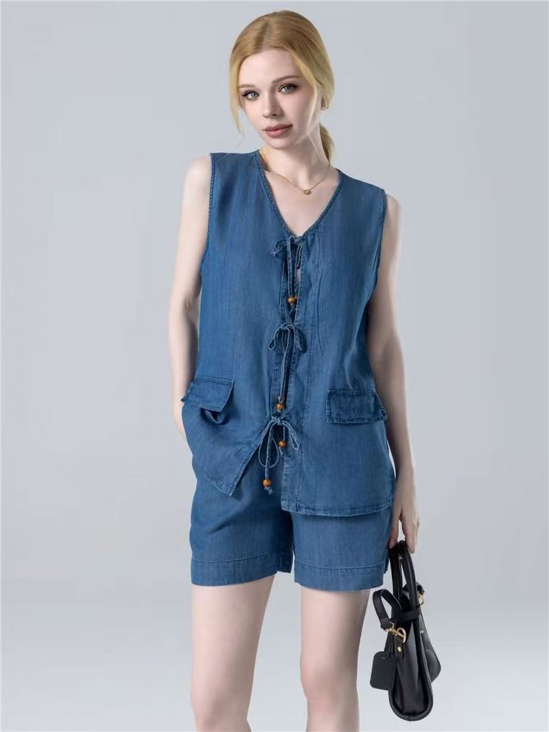 Conjunto de colete e shorts jeans com cadarço.