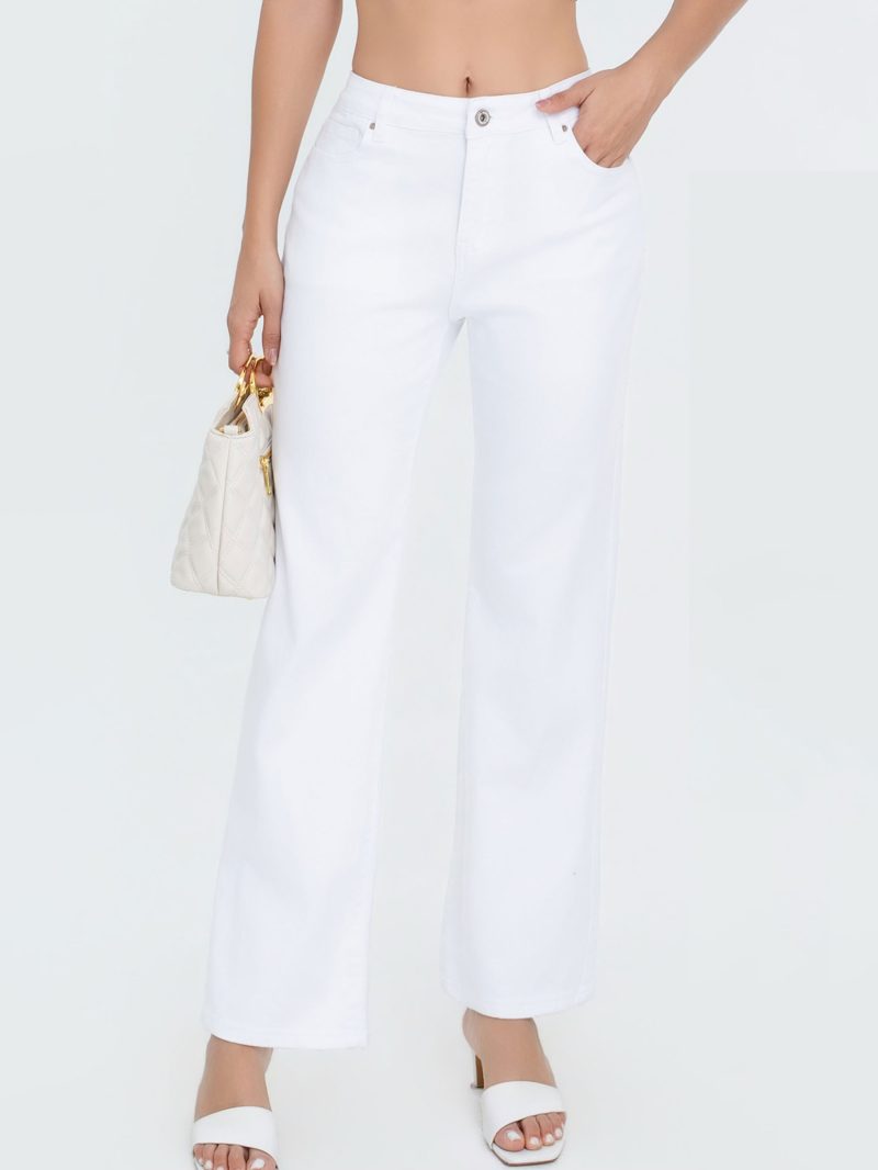 Calça jeans básica. Tamanho grande. Cintura alta. Cinco bolsos. Fecho frontal com zíper e botão metálico.