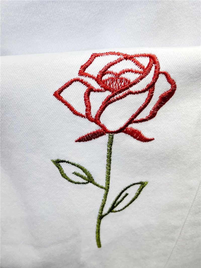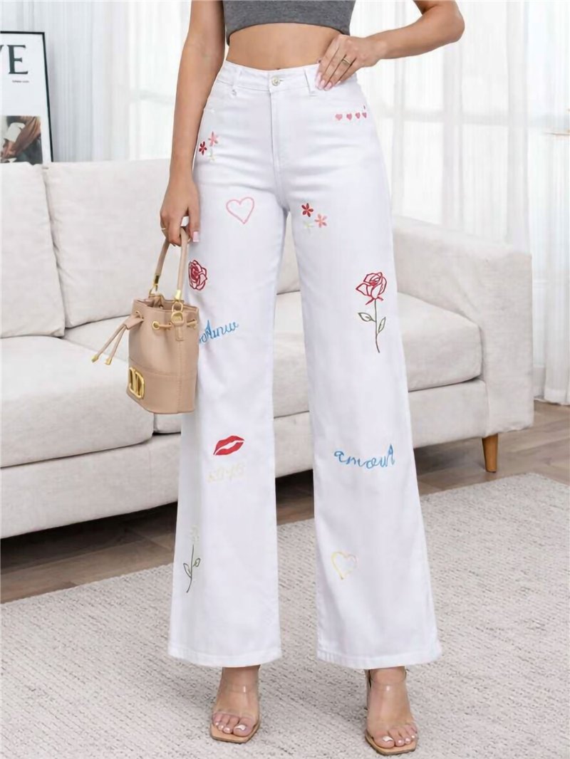 Calça jeans reta. Detalhe de coração e flor bordados multicoloridos. Motivo de lábios bordado. Cintura alta. Cinco bolsos. Fecho frontal com zíper e botão metálico. Gancho de 27 cm. Comprimento de 103 cm. Barra de 29 cm.