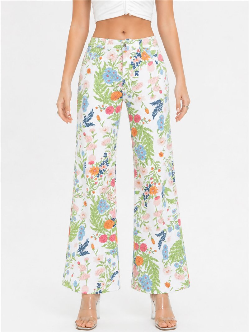 Calça jeans com estampa floral. Cintura alta. Pernas largas. Fecho frontal com zíper e botão. Gancho: 26 cm. Comprimento: 104 cm. Barra: 28 cm.