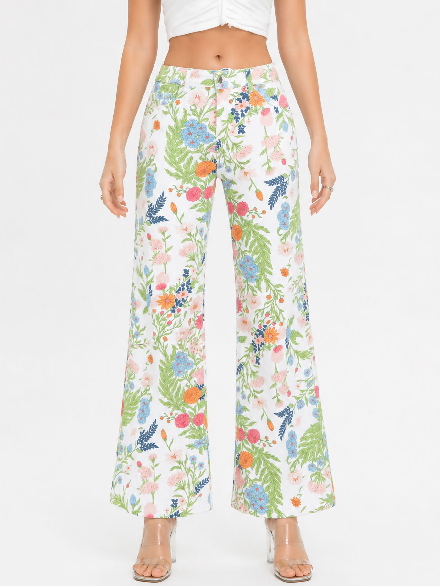 calça jeans de perna larga com estampa floral