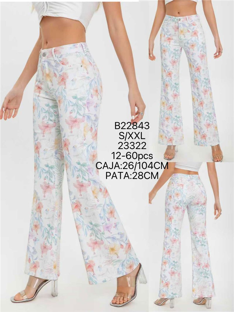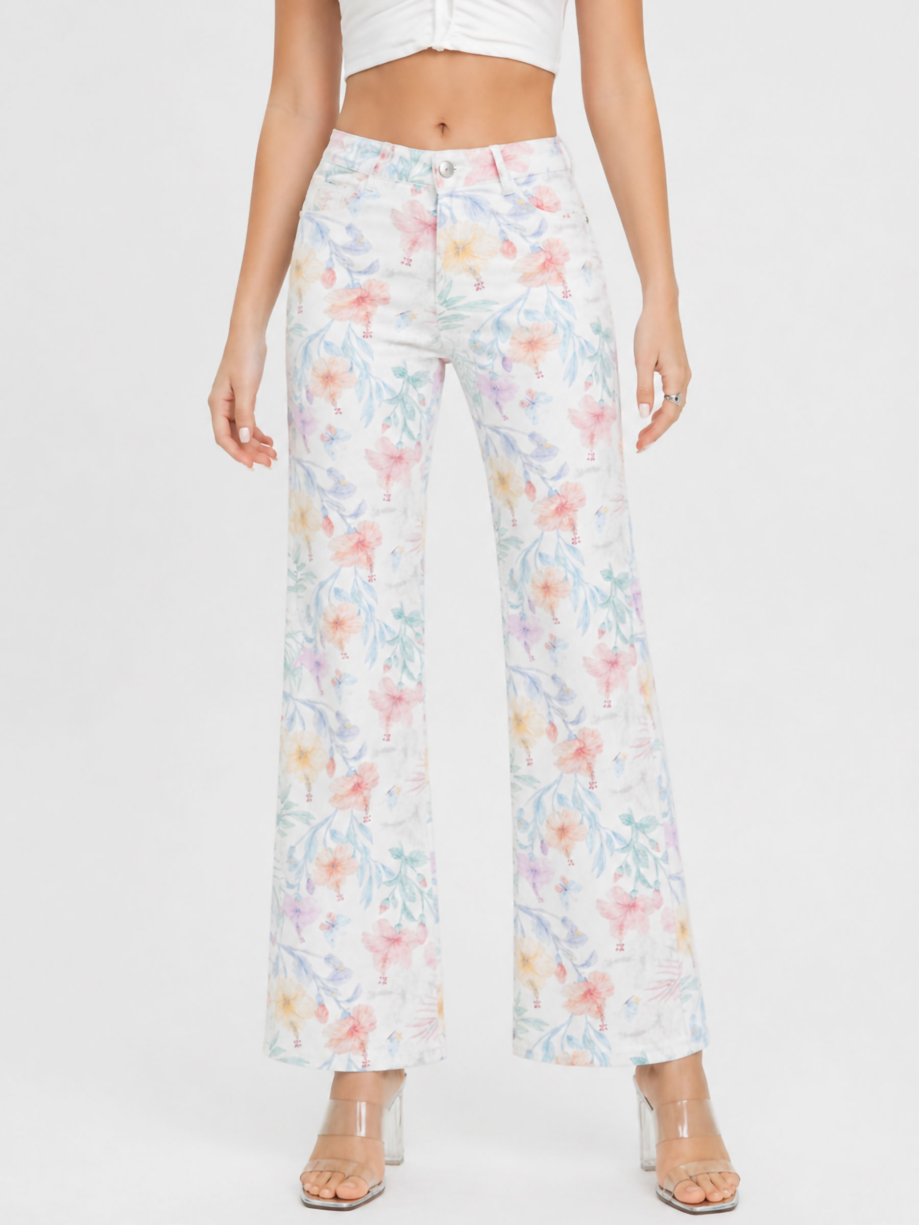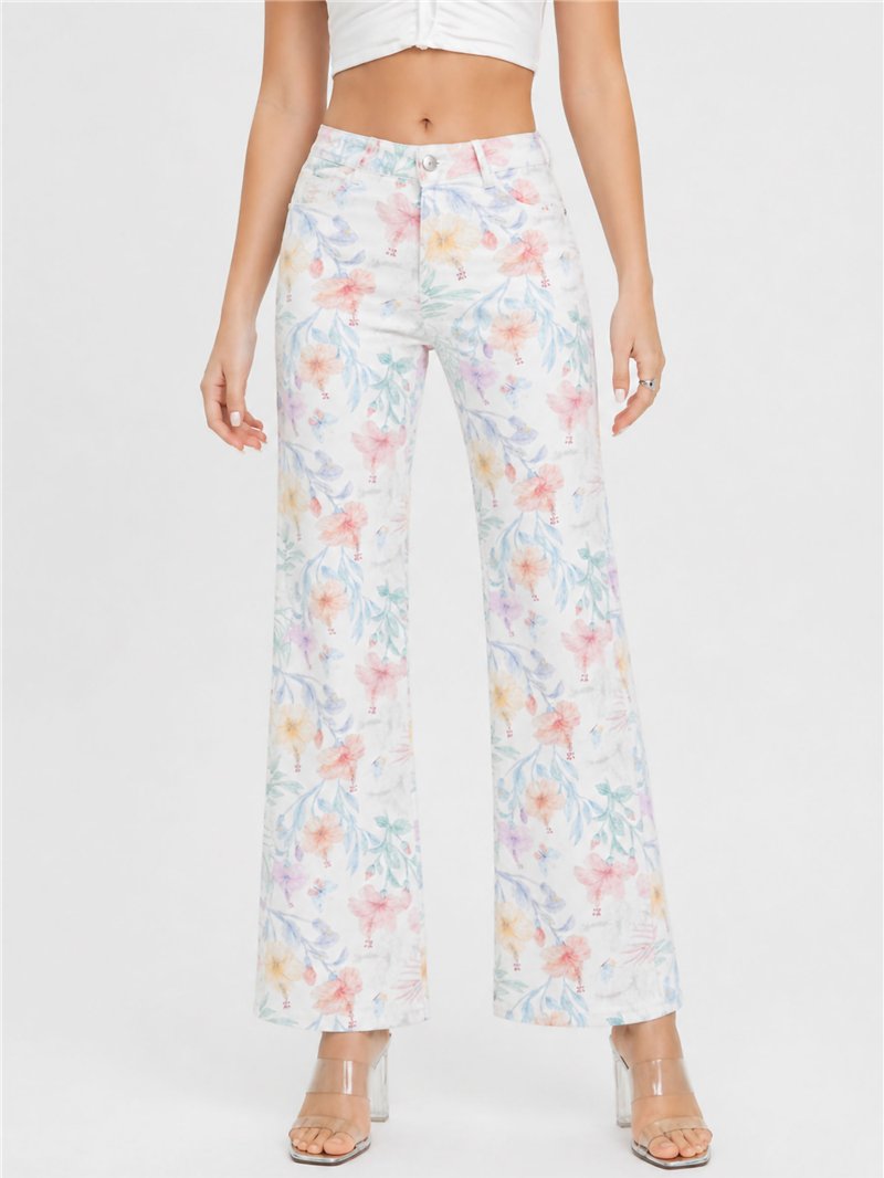 Calça jeans com estampa floral. Cintura alta. Perna larga. Cinco bolsos. Fecho frontal com zíper e botão metálico. Gancho: 26 cm. Comprimento: 104 cm. Barra: 28 cm.