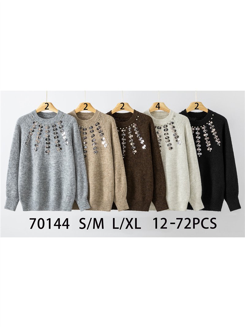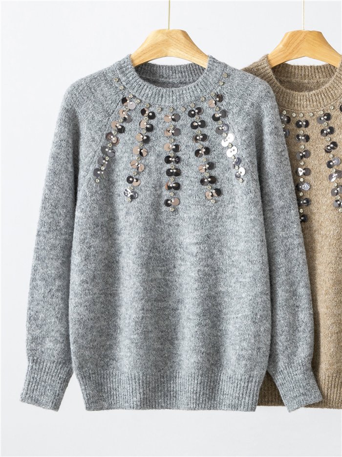 Camisola de malha quente com pelo. Detalhe de lantejoulas. Gola redonda. Manga comprida.