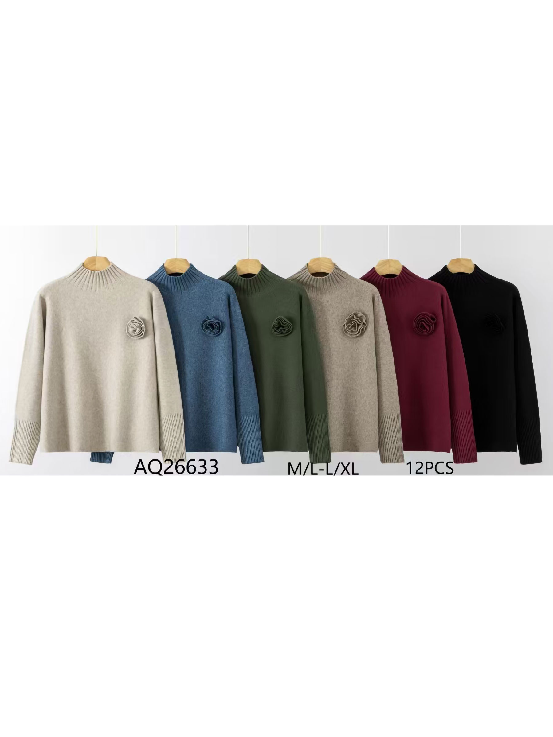Camisola larga e macia. Malha quente. Toque suave. Detalhe de broche de flor combinando. Gola perkins. Acabamentos em rib. Manga comprida.