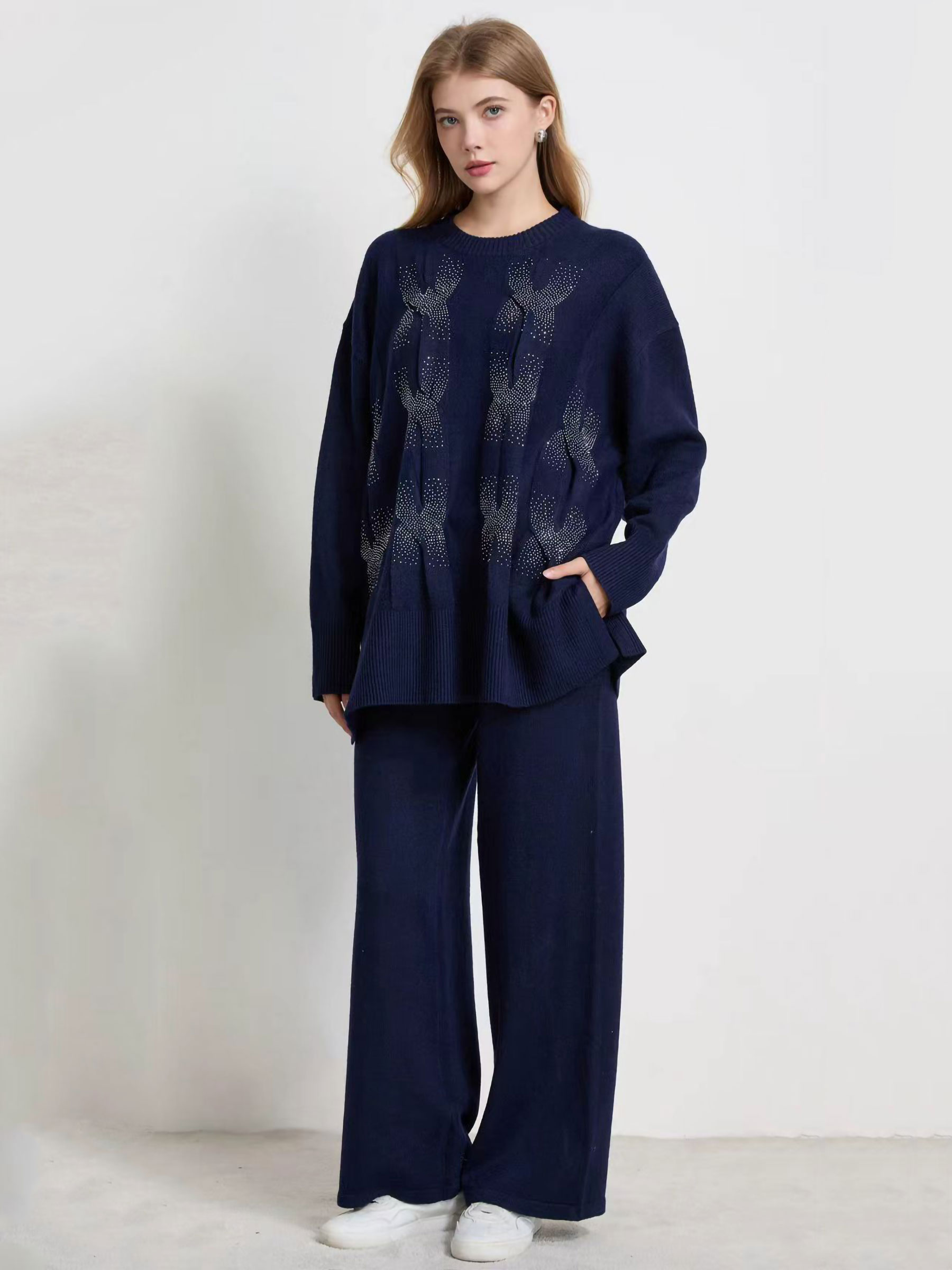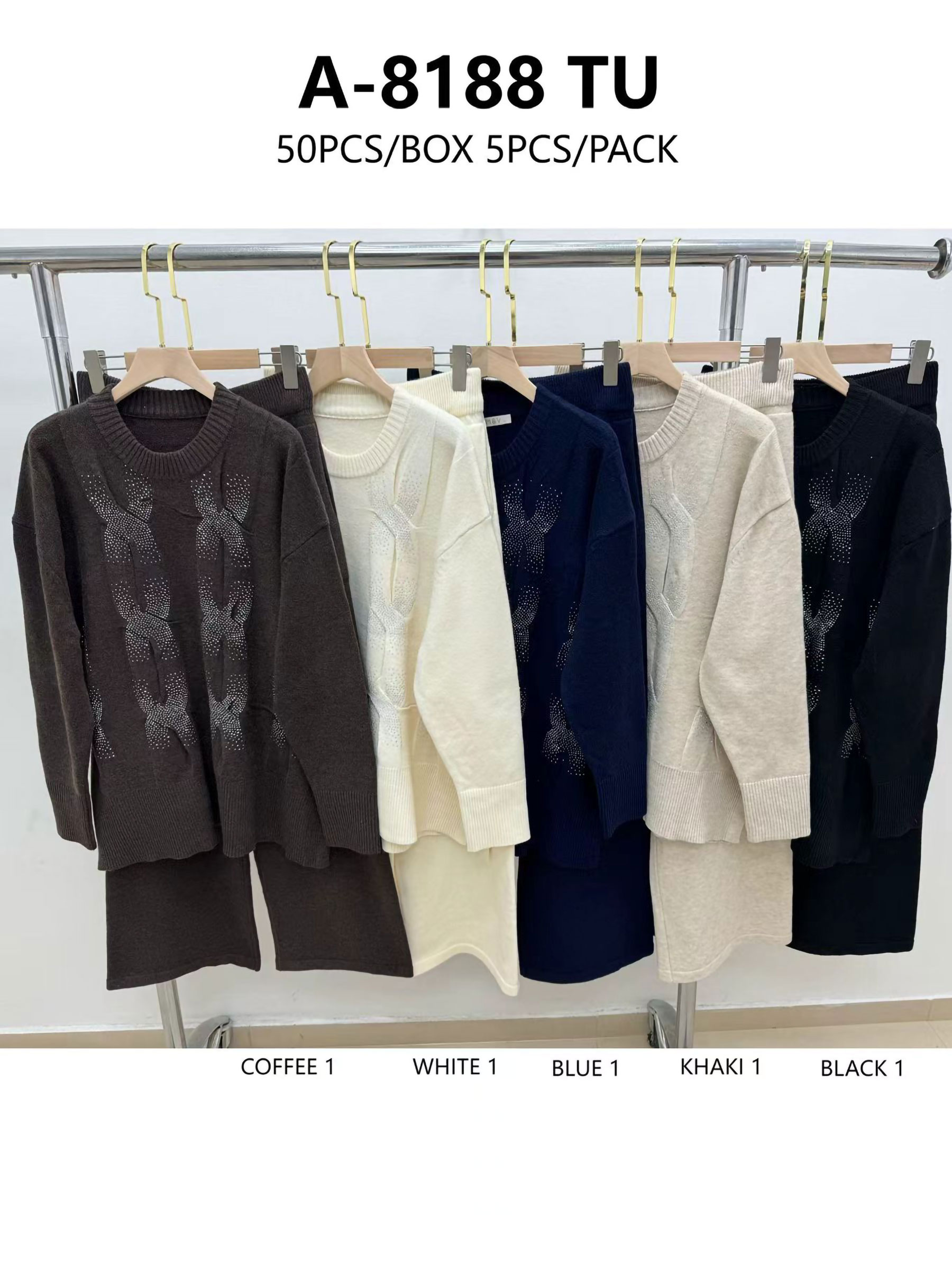 Detalles de conjunto jersey trenzado strass talla grande + pantalón punto LS-A8188
