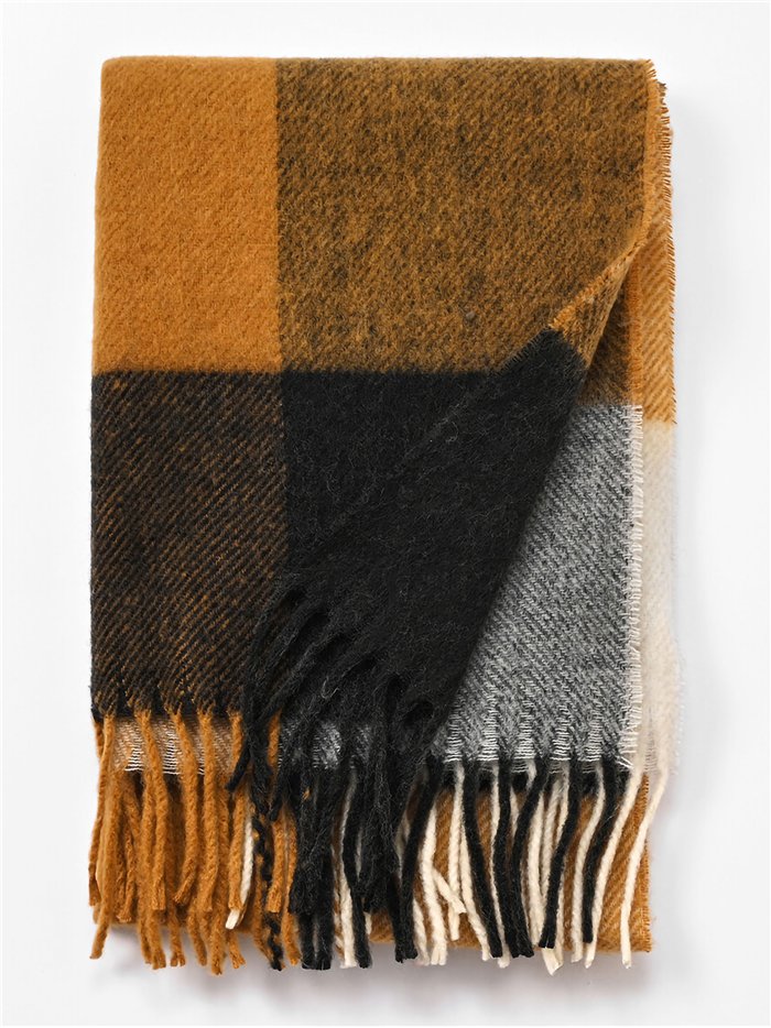 Cachecol xadrez com franjas, tecido de toque suave.