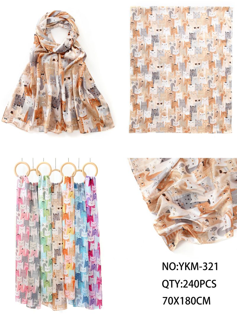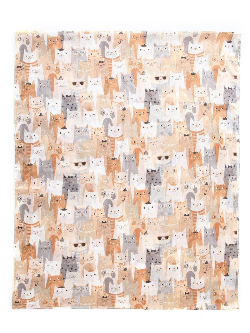 Cachecol multicolorido com estampa de gato e detalhes dourados.