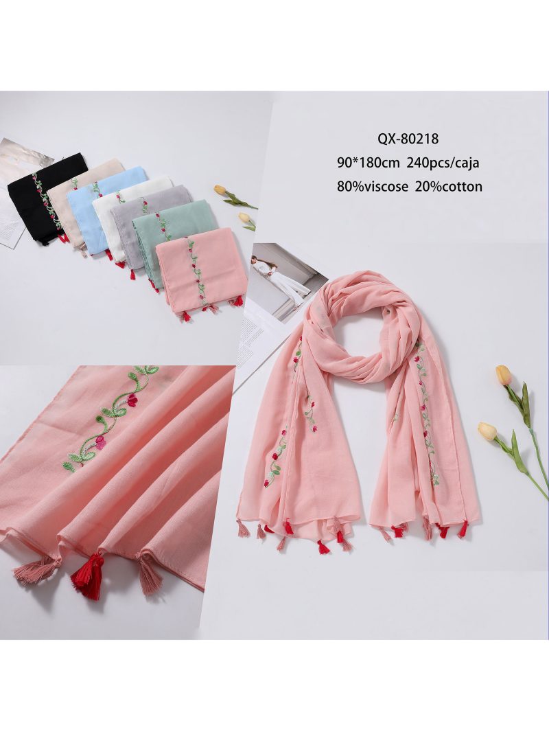Lenço bordado com flores e franjas.