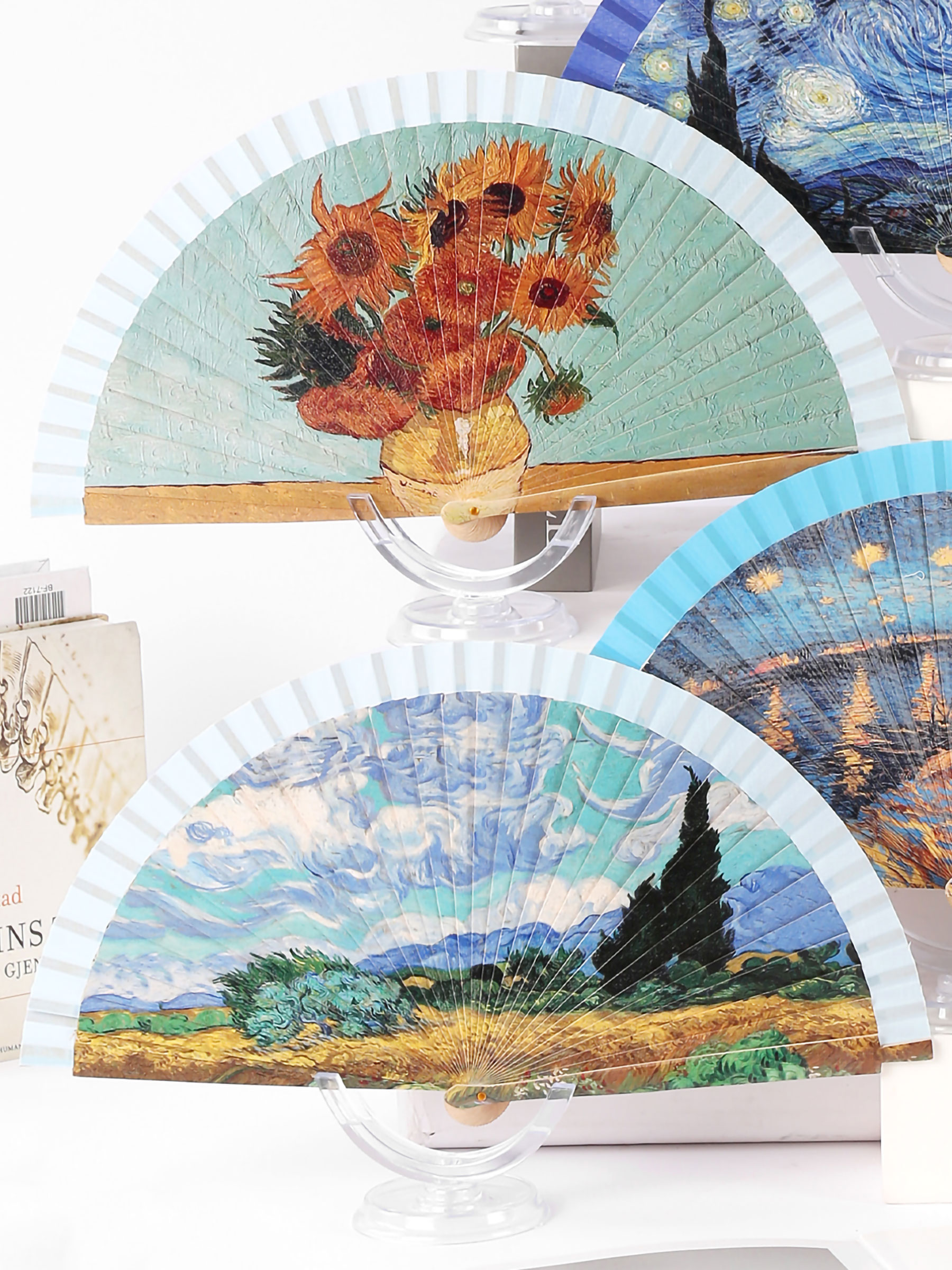 Leque de madeira. Estampa artística. Face única. 23 cm. Modelos variados.