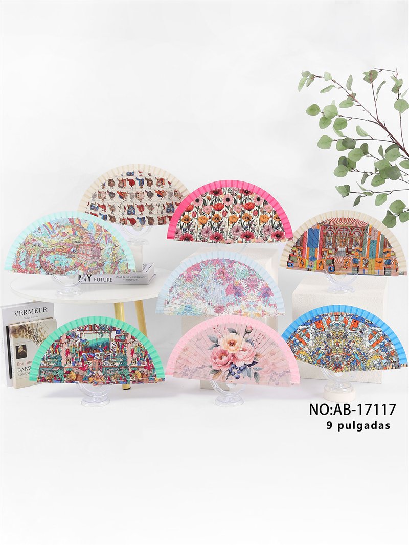Leque de madeira com estampa artística variada. Face única. 23 cm. Cores sortidas.