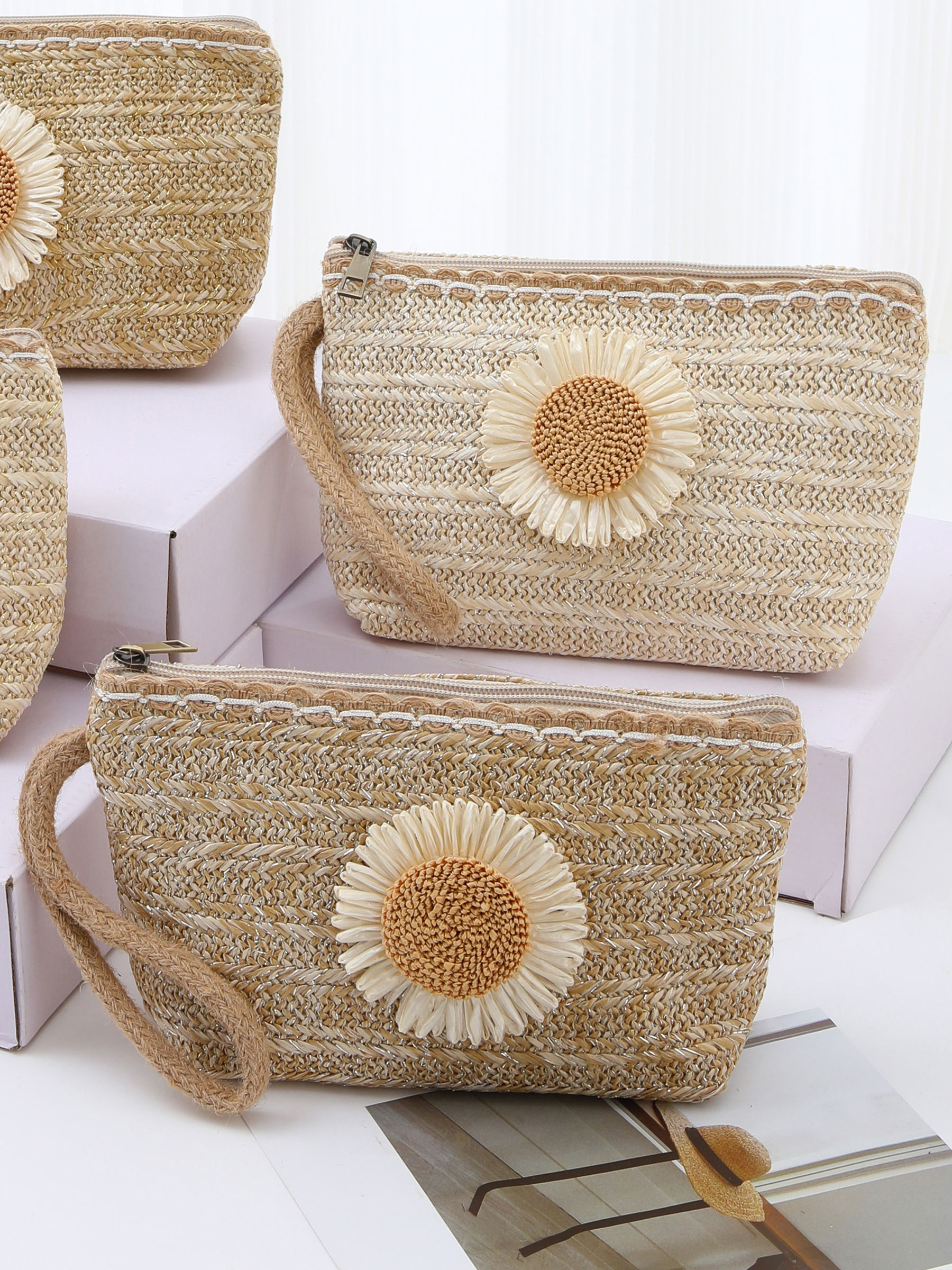 Necessaire com estampa de margarida e efeito ráfia.