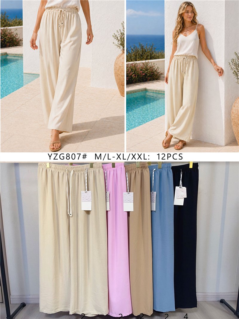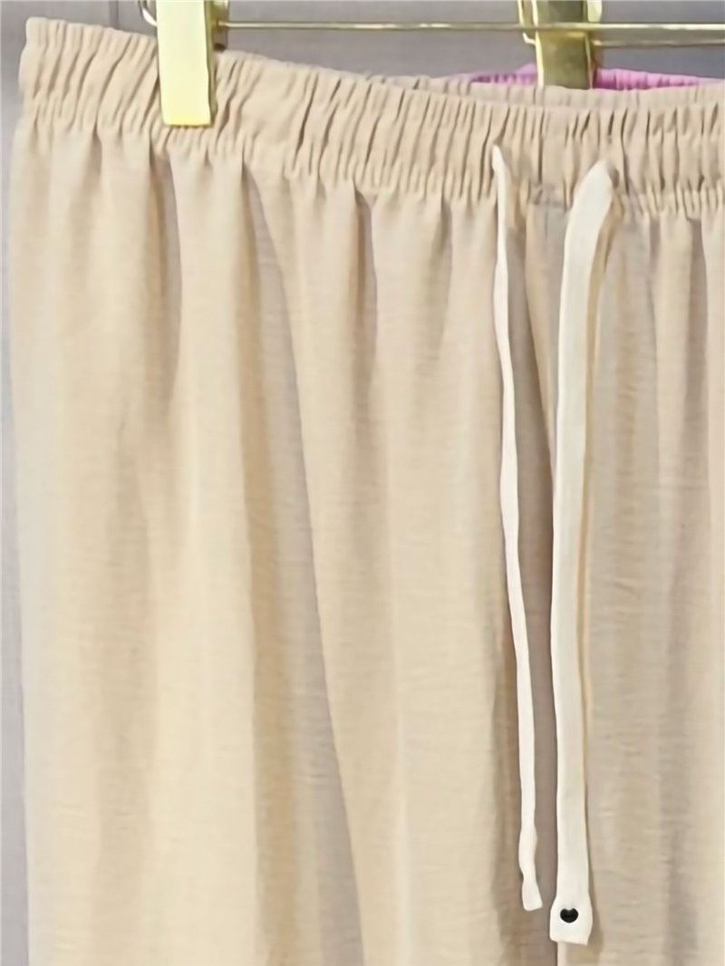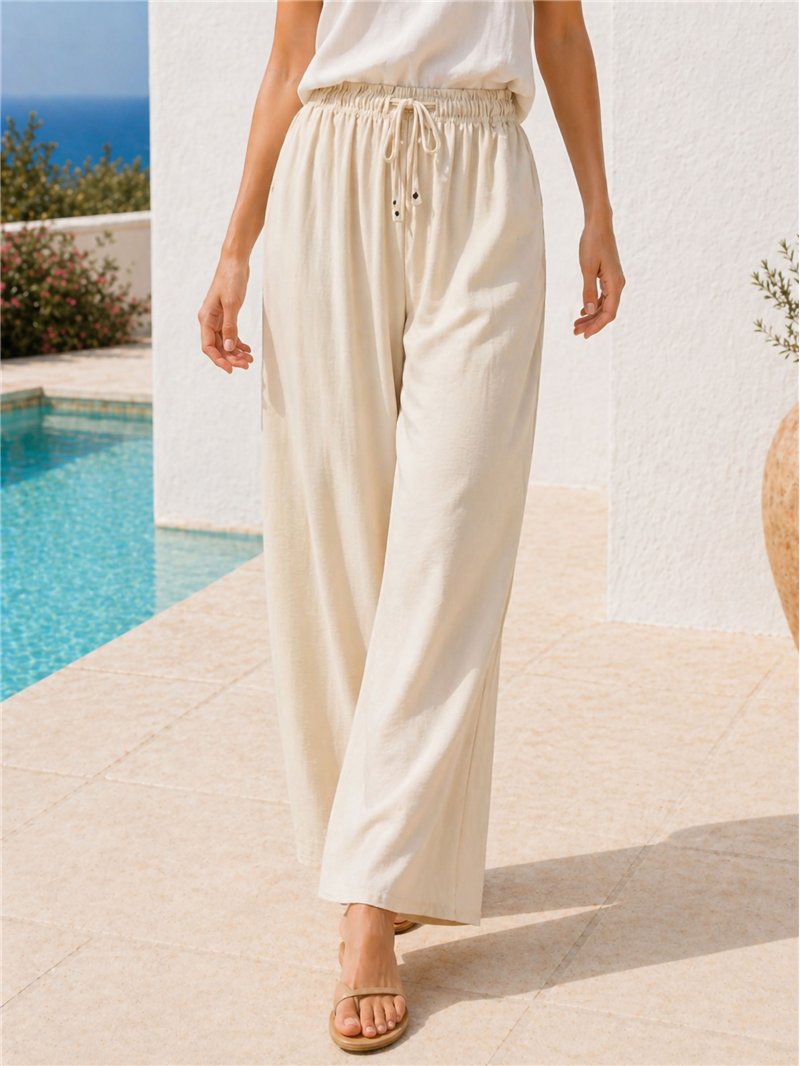 Calça palazzo lisa. Cintura elástica. Cordão ajustável. Pernas largas. Tecido fluido.