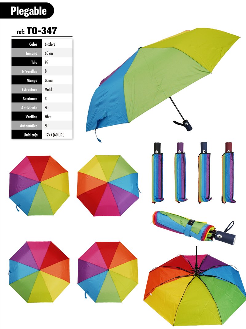 Guarda-chuva dobrável multicolorido. Tecido PG. Antivento. Automático. 8 varetas de fibra. Cabo de borracha. Estrutura de metal. 3 seções. Cores sortidas. Comprimento: 60 CM.