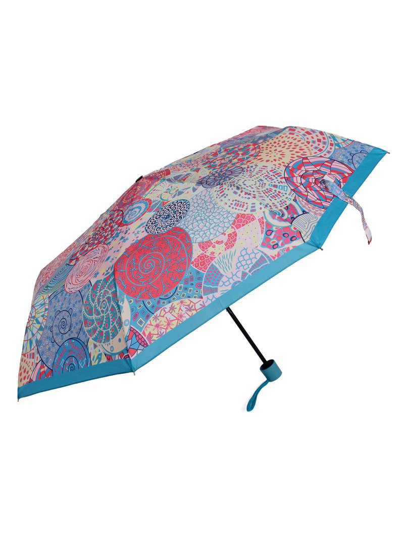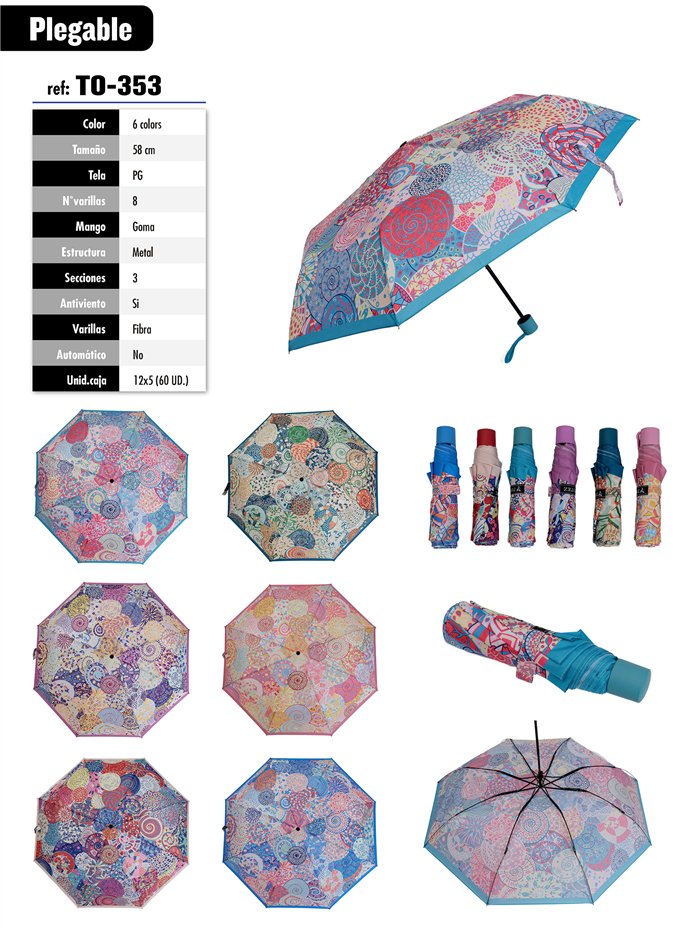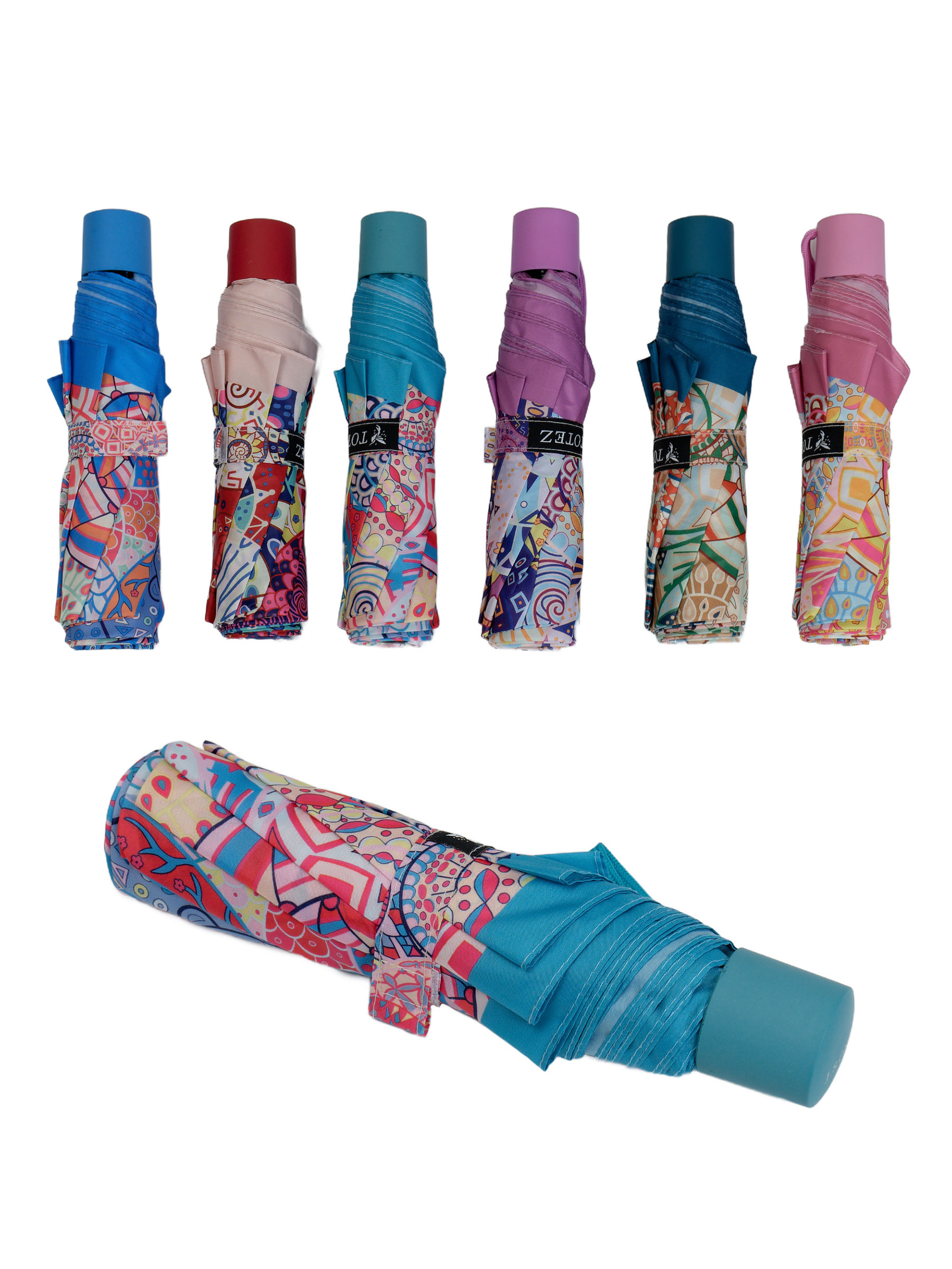 Guarda-chuva dobrável mandala. Tecido PG. Antivento. Não automático. 8 varetas de fibra. Cabo de borracha. Estrutura de metal. 3 seções. Cores sortidas. Comprimento: 58 CM.