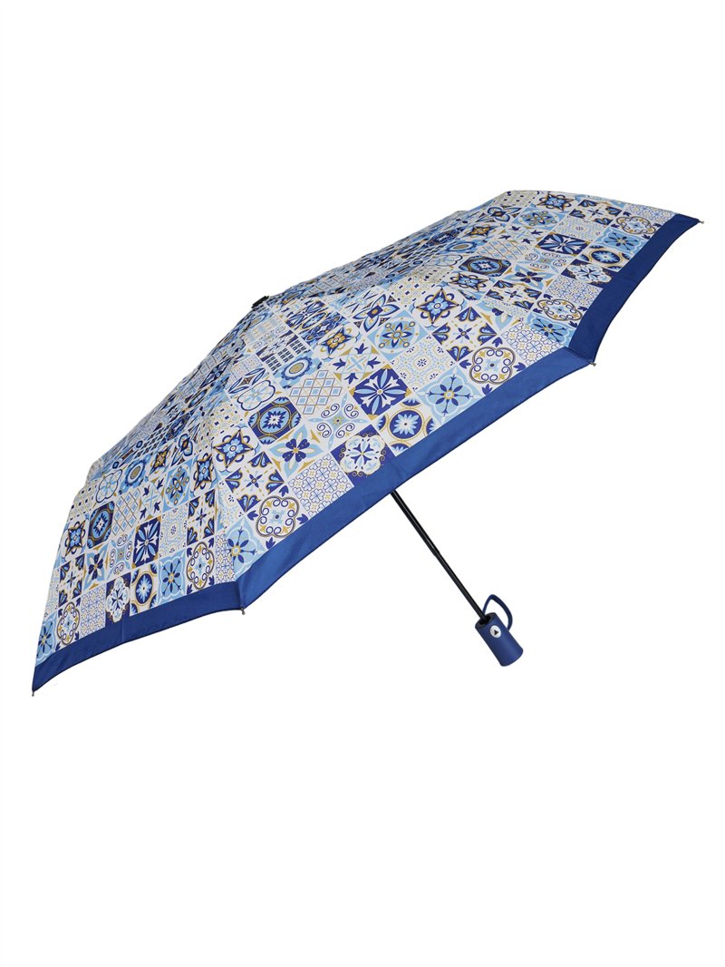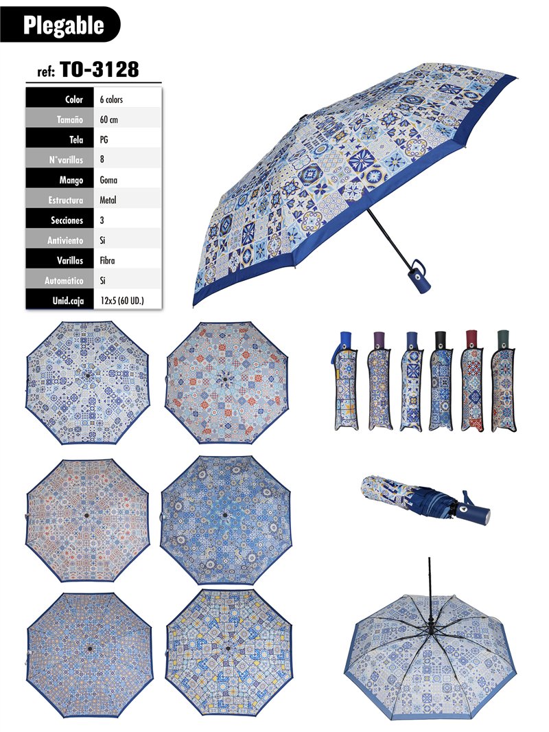 Guarda-chuva dobrável estampado. Tecido PG. Antivento. Automático. 8 varetas de fibra. Cabo de borracha. Estrutura de metal. 3 seções. Cores sortidas.