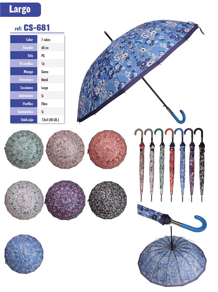 Guarda-chuva longo automático com pequenas flores. Cúpula de 68 cm em tecido PG, 16 varetas de fibra e estrutura metálica. Resistente ao vento e com cabo de borracha.