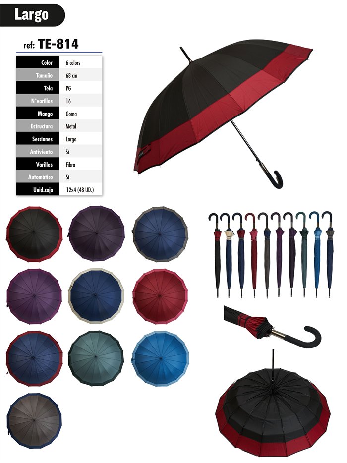 Guarda-chuva longo automático de 16 varetas com faixa inferior em cor contrastante. Varetas de fibra e estrutura metálica antivento, cabo de borracha e tecido PG.