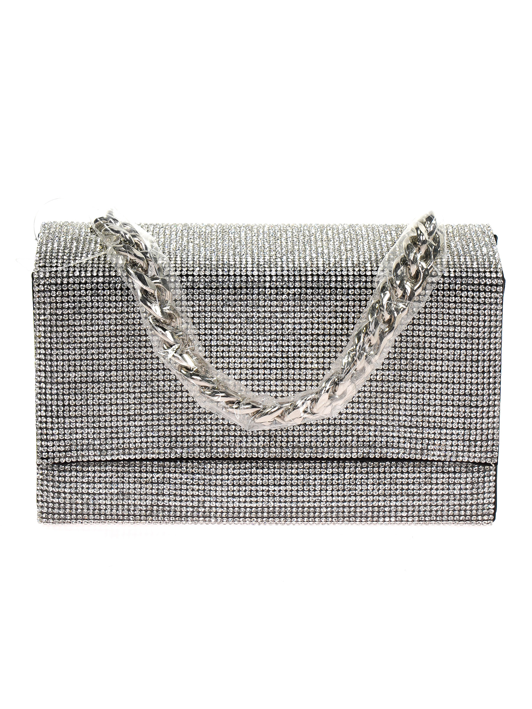 Bolsa de festa. Material cetim. Detalhe de pedrarias em ambos os lados. Alça de mão. Alça de ombro em corrente. Forro com bolso interno. Fecho magnético.