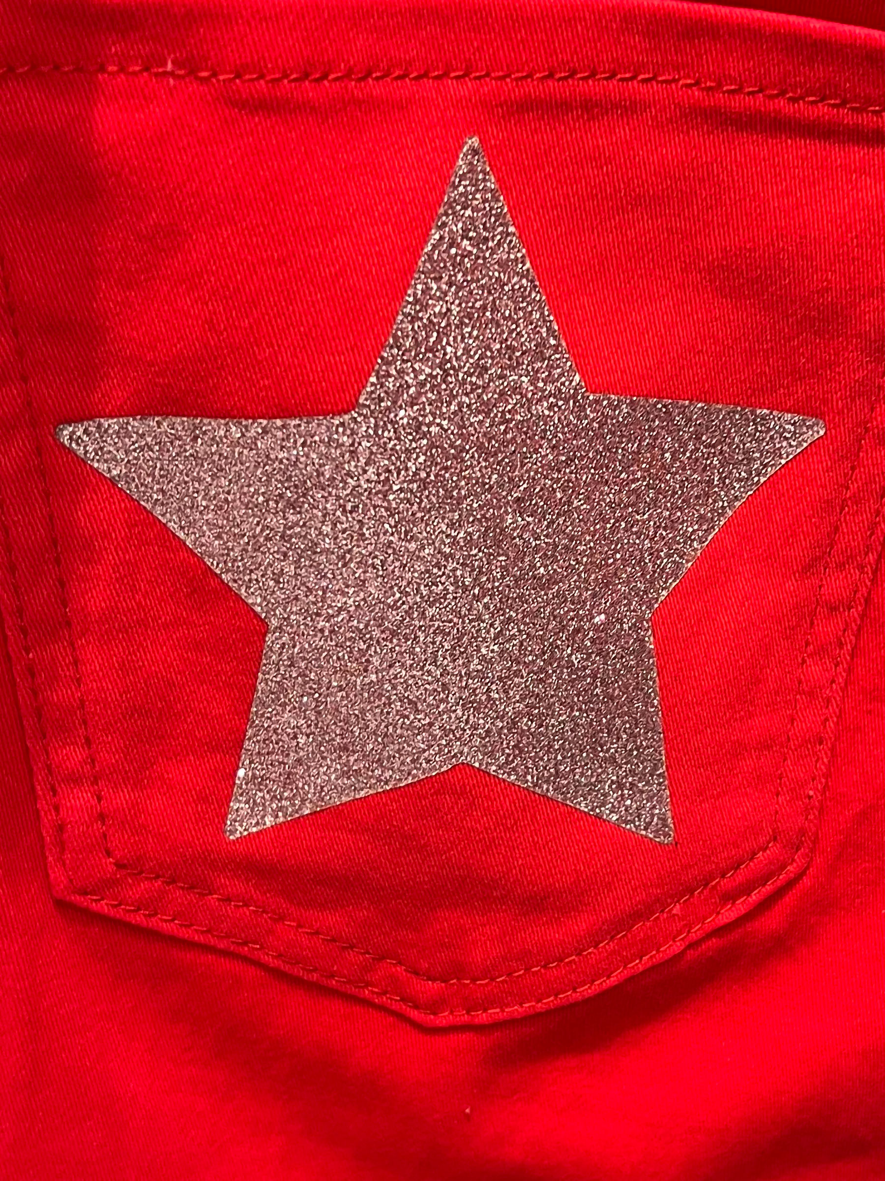 Bermuda jeans. Detalhe de estrela com glitter nos bolsos traseiros. Cintura alta. Cinco bolsos. Barra dobrada. Fecho frontal com zíper e botão metálico. Gancho: 28 cm. Comprimento: 43 cm. Barra: 29 cm.