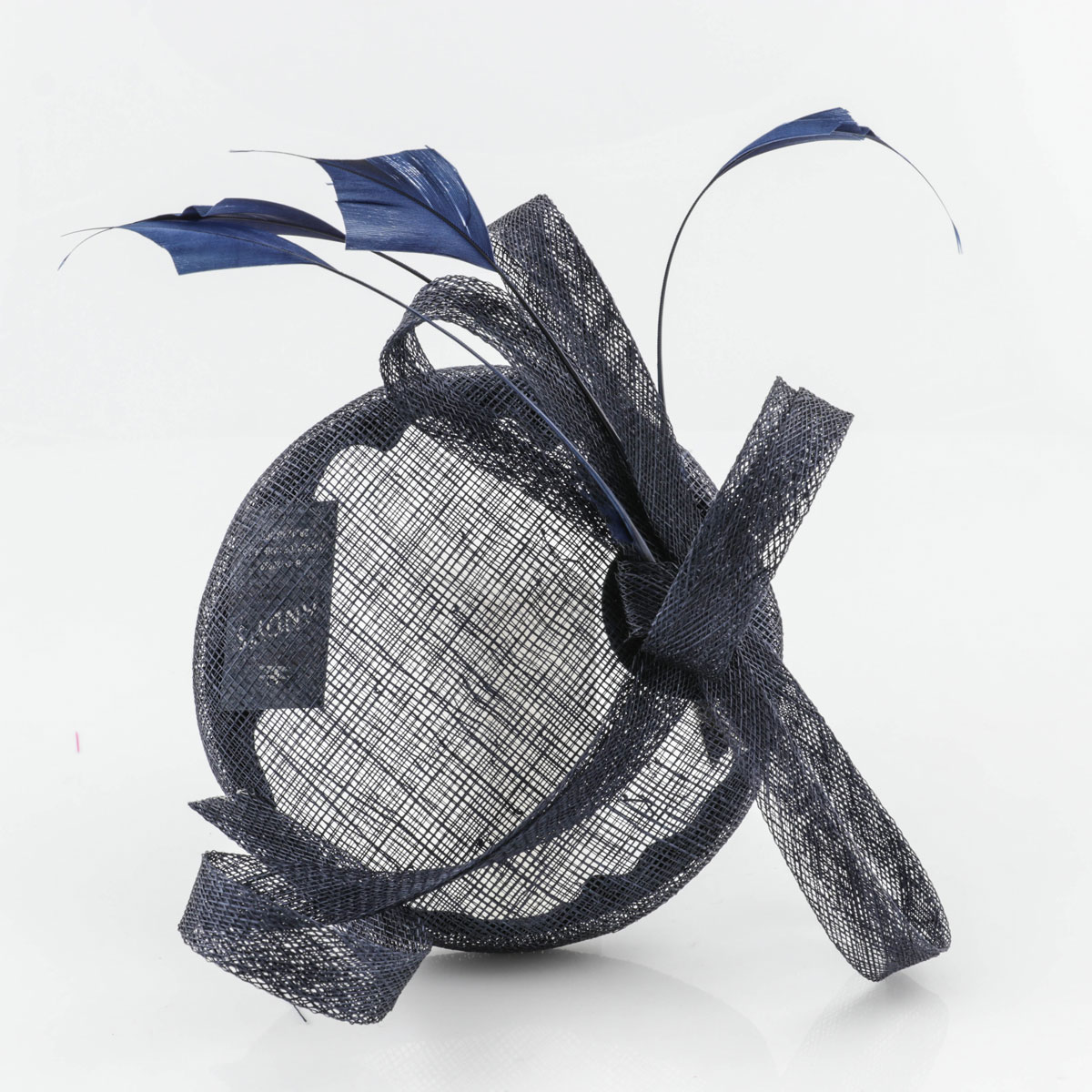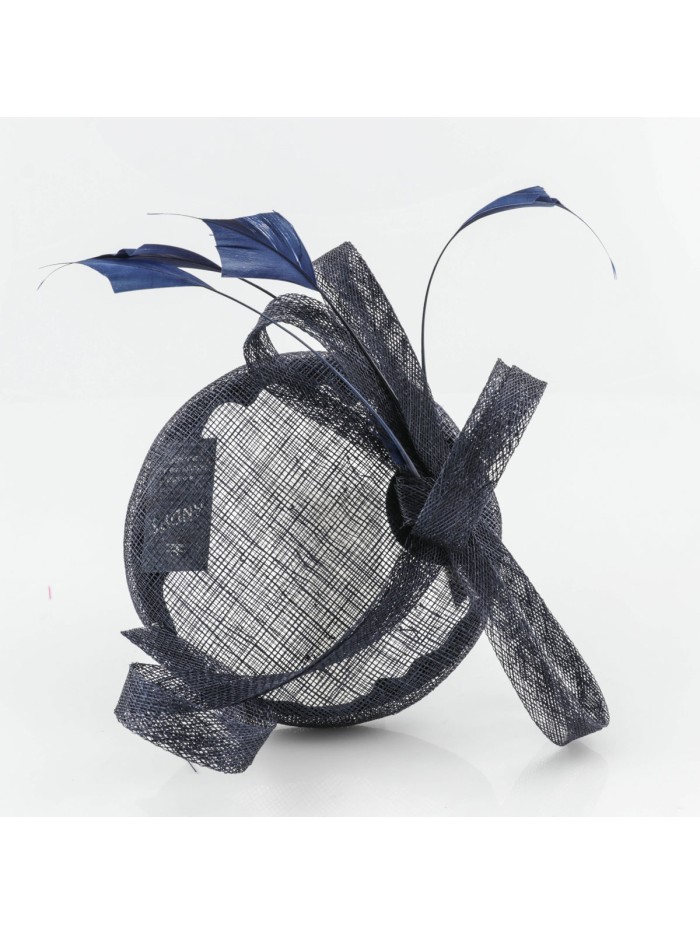 Tocado médio com laços. Detalhe de penas. Fixação com pinça e tiara.
