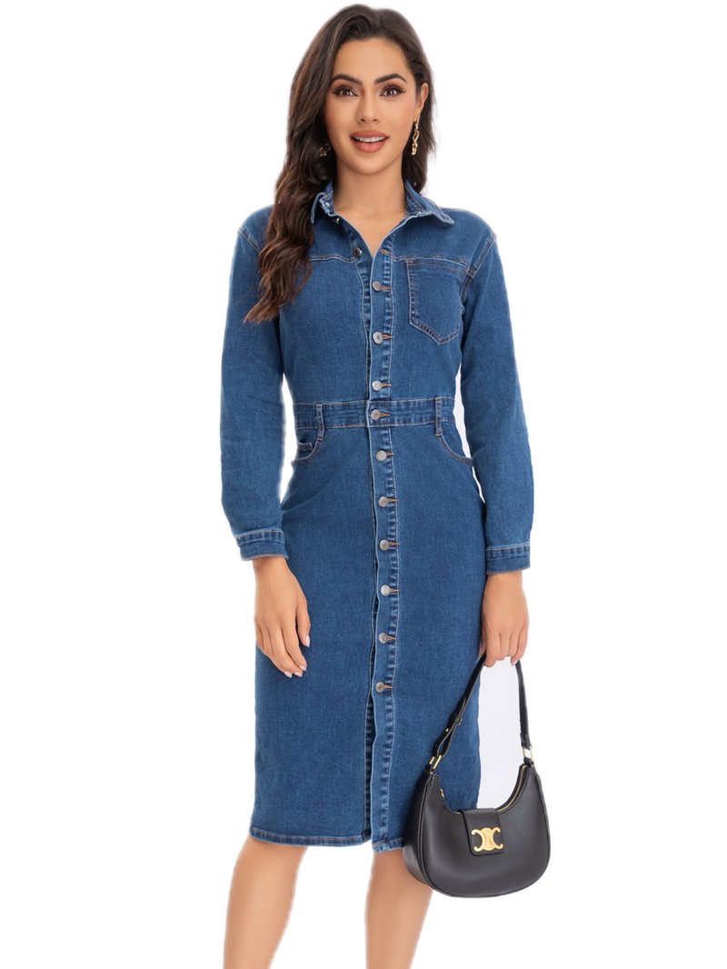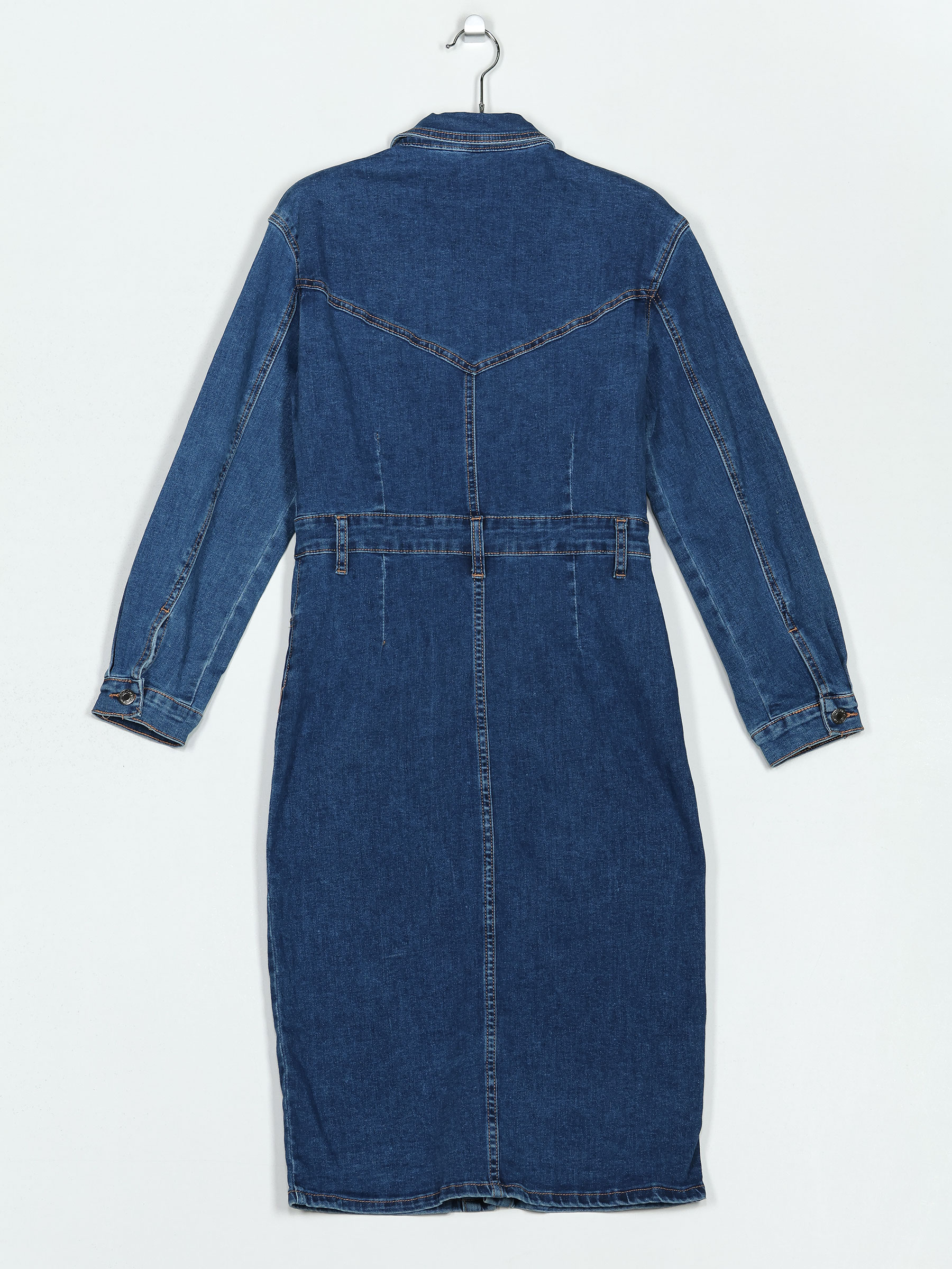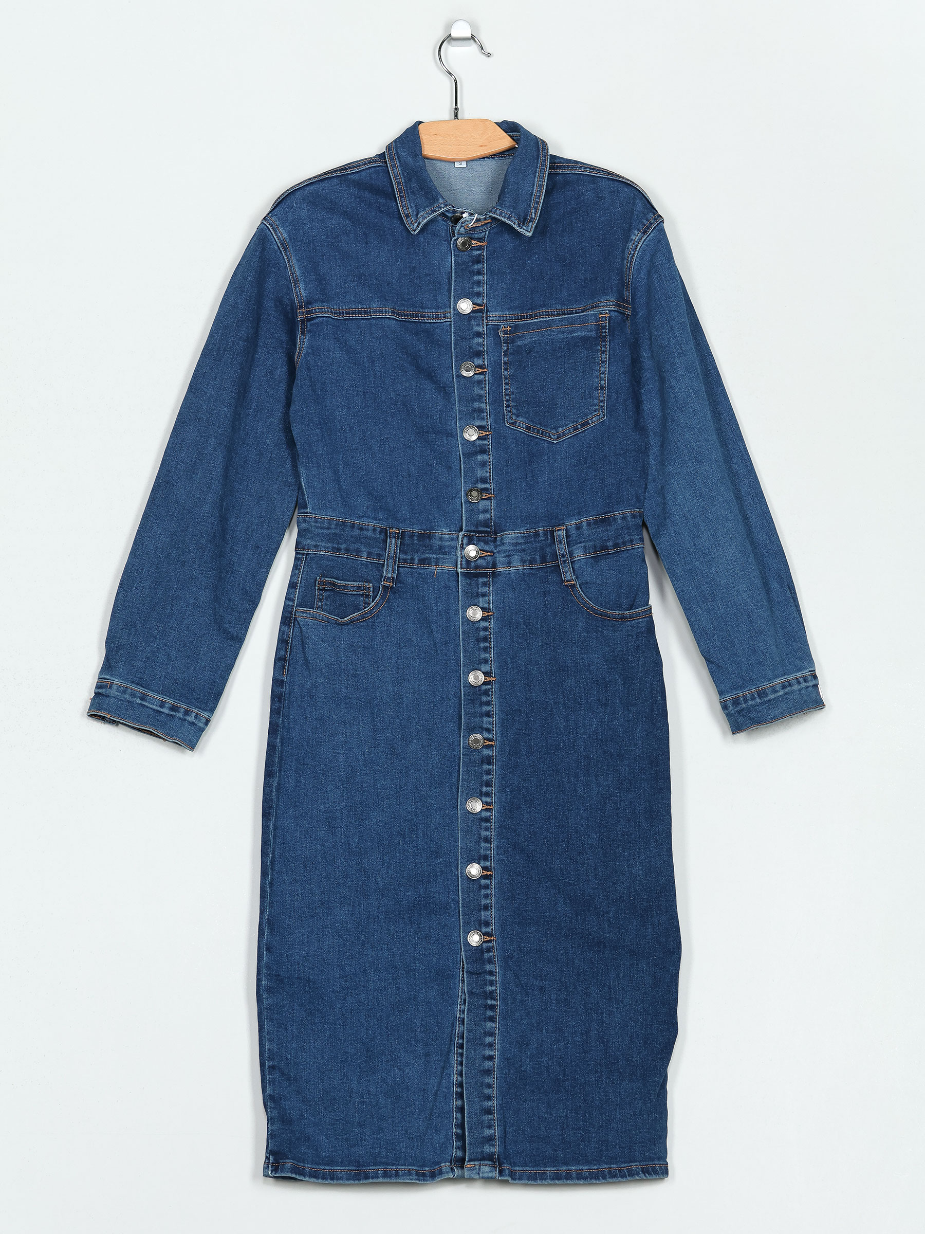 Vestido camiseiro em denim. Gola de lapela. Manga comprida. Fecho frontal com botões.