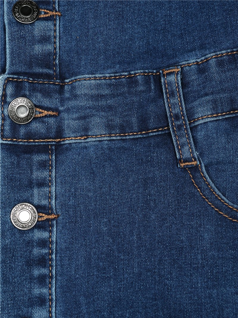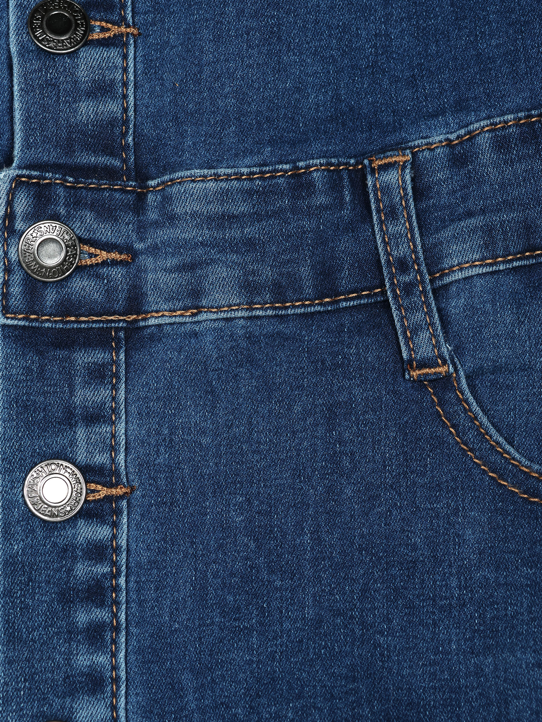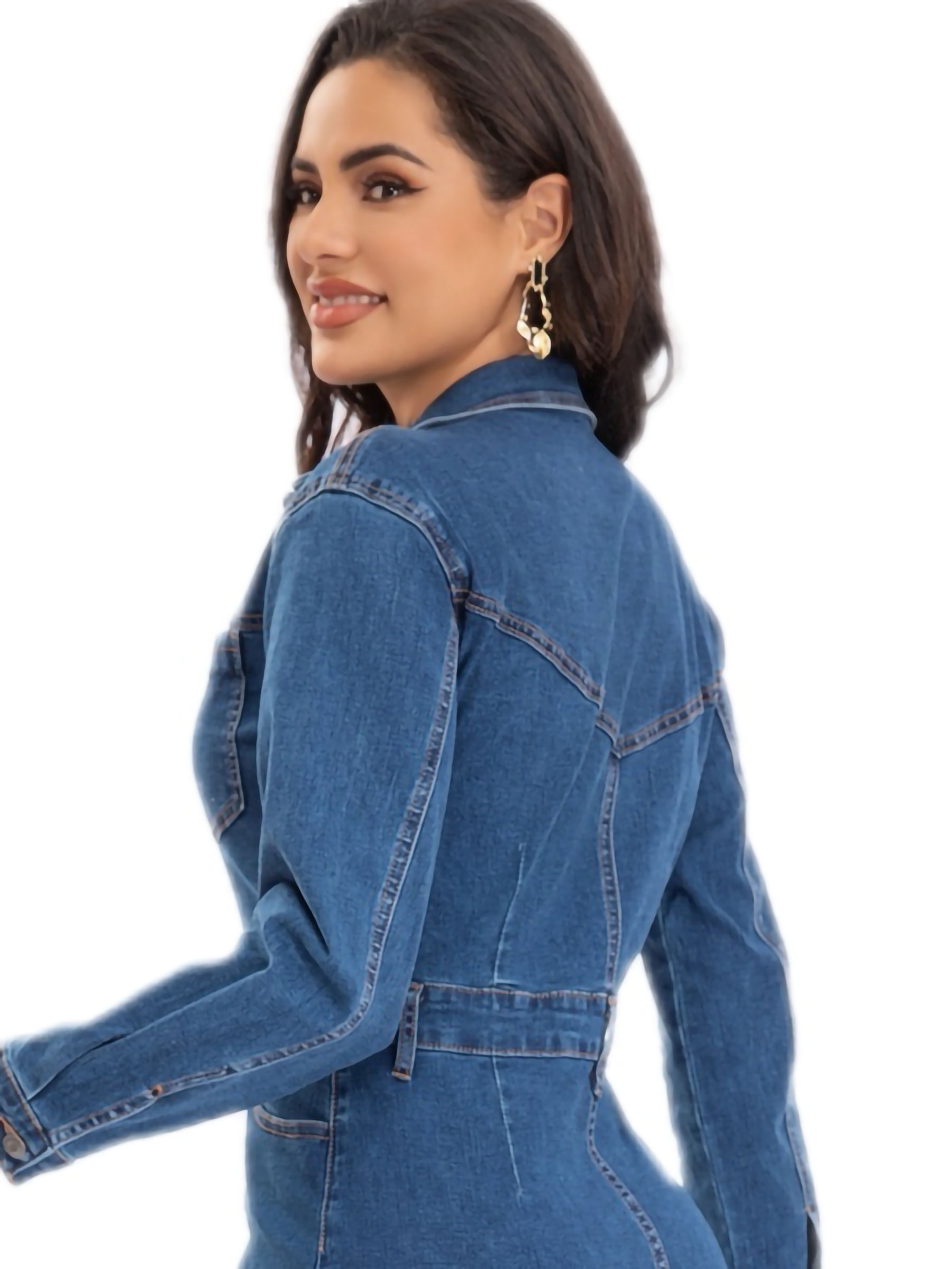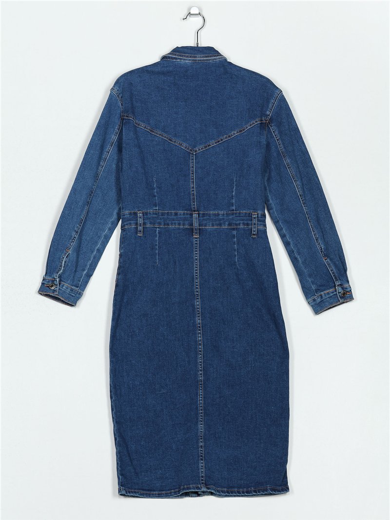 Vestido camiseiro em denim. Gola de lapela. Manga comprida. Fecho frontal com botões.