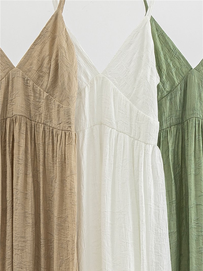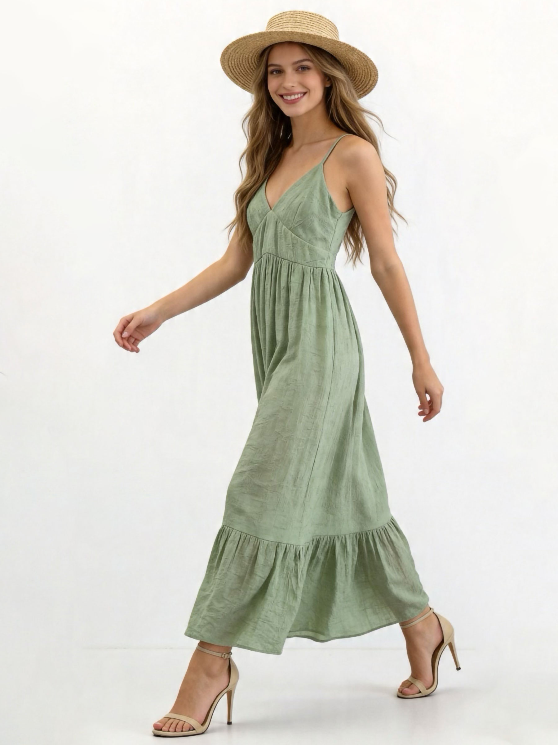 Vestido longo com efeito plissado. Decote em V. Alças finas. Corte abaixo do busto. Barra com babados.